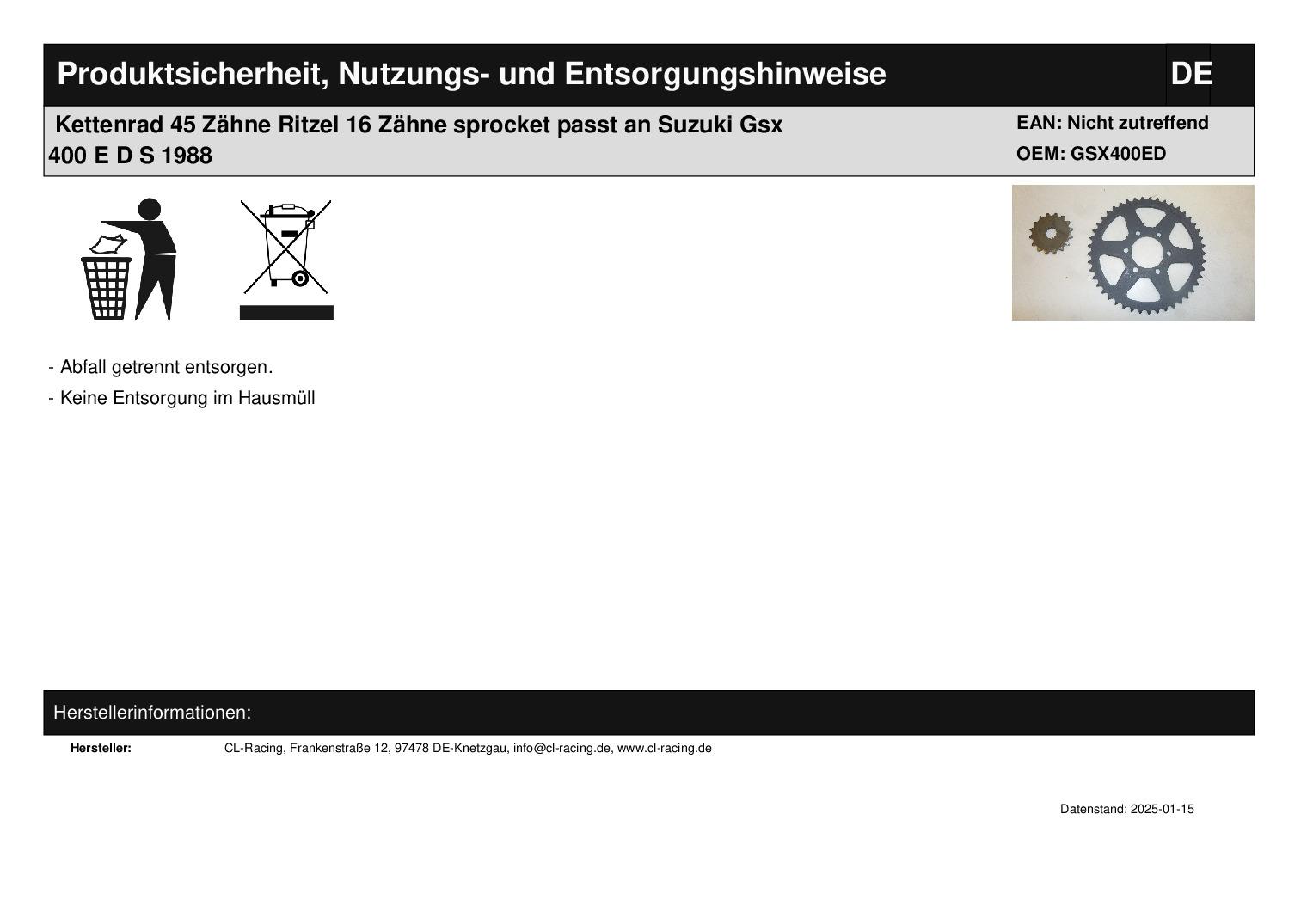 In dieser Auktion gibt es folgenden Artikel zu kaufen: Marken-Kettenrad und -Ritzel (siehe Foto) Hersteller: Afam Modell: passend für Suzuki GSX 400E D S Bj.: 88 Übersetzung: 16 x 45