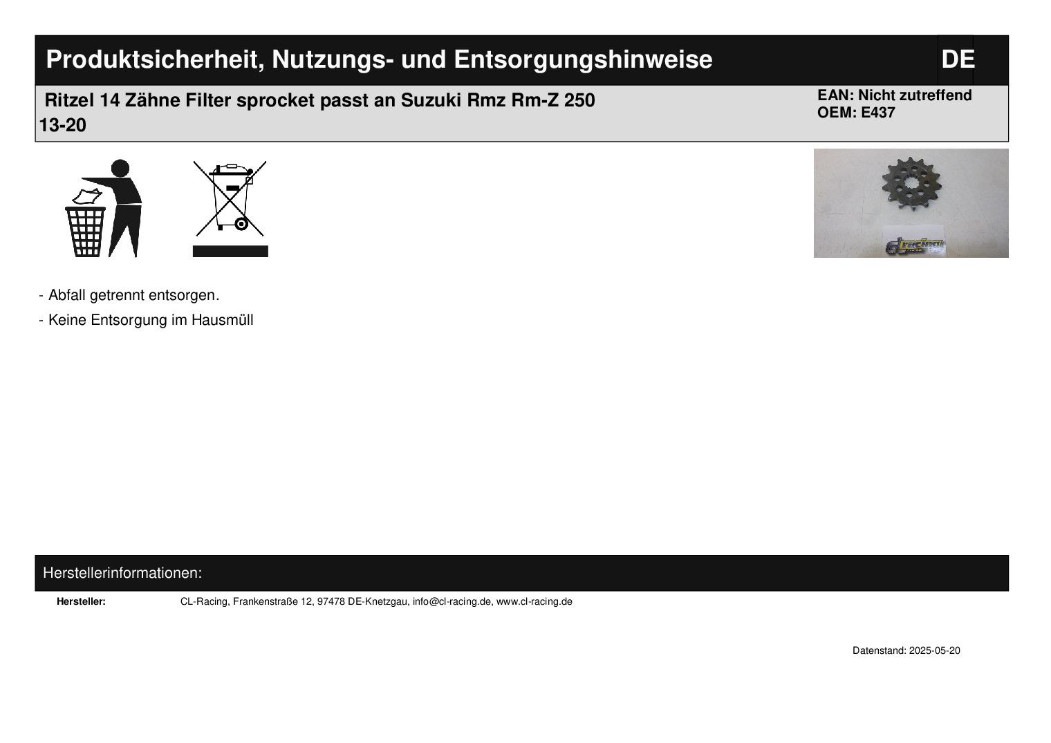 In dieser Auktion gibt es folgenden Artikel zu kaufen: Ritzel (siehe Foto) Modell: passend für Suzuki RMZ 250 Bj.: 13 - 20 Zähnezahl: 14 Vor dem Kauf bitte Übersetzung mit Ihrem Fahrzeug vergleichen! Lieferumfang: 1 Stück Artikelzustand: neu Bei Unklarheiten oder Fragen bitte erst E-Mail schreiben.