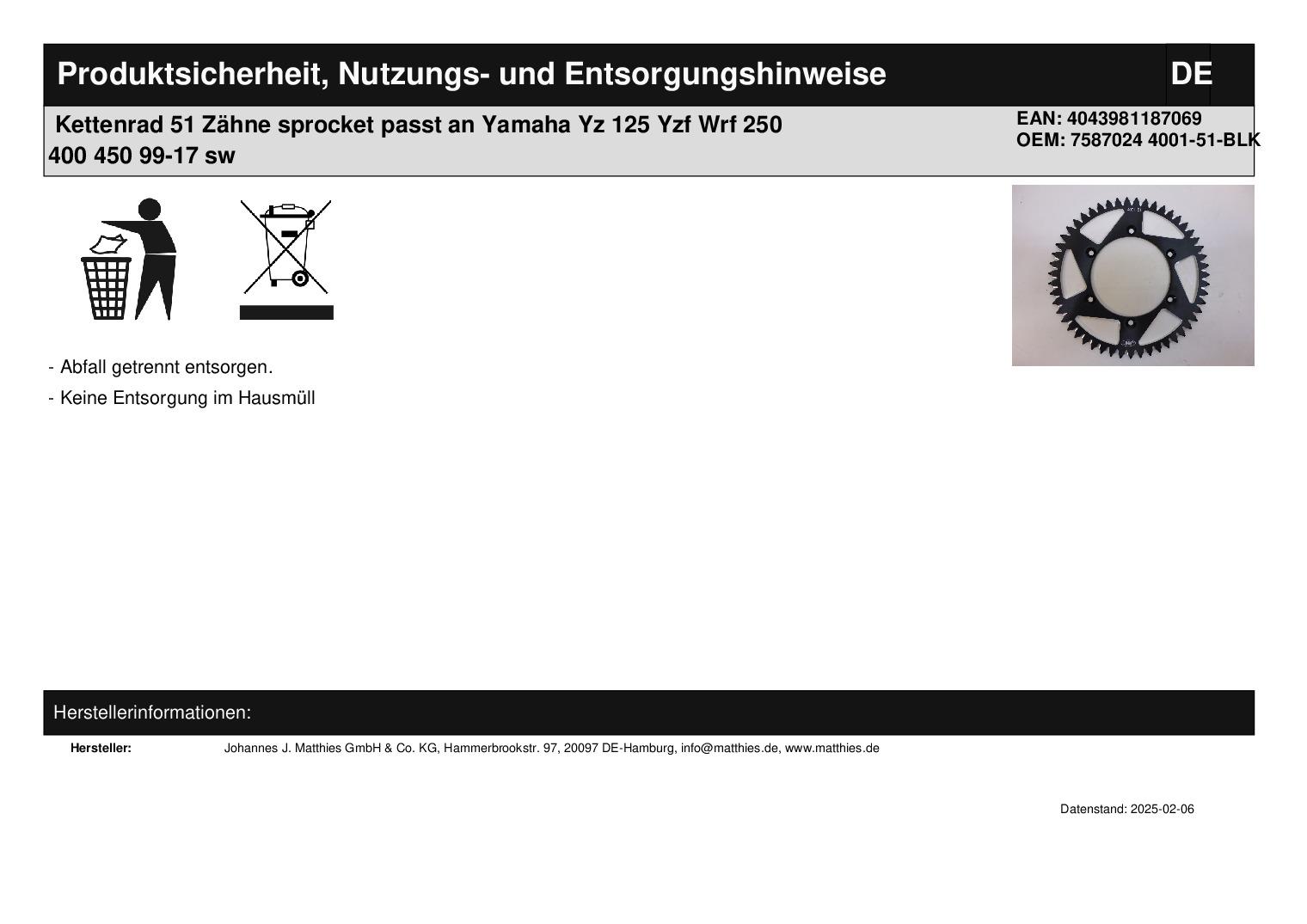 In dieser Auktion gibt es folgenden Artikel zu kaufen: Qualitäts-Kettenrad (siehe Foto) Modell: passend für Yamaha Yz 125, 250 Bj.: 1999 - 2017 (2-Takt) Yzf 250, 400, 426, 450 Bj.: 1999 - 2017 (4-Takt) Wrf 250, 400, 426, 450 Bj.: 1999 - 2017 (4-Takt) Vor dem Kauf bitte Übersetzung mit Ihrem Fahrzeug vergleichen! Zähnezahl: 51
