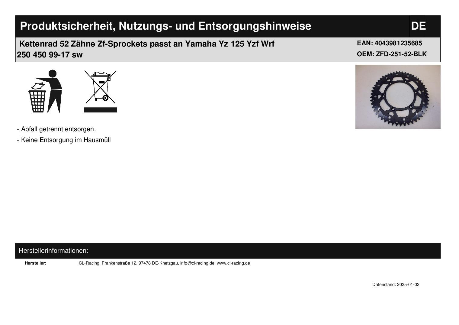 Titel: Kettenrad 52 Zähne Zf-Sprockets passt an Yamaha Yz 125 Yzf Wrf 250 450 99-17 sw