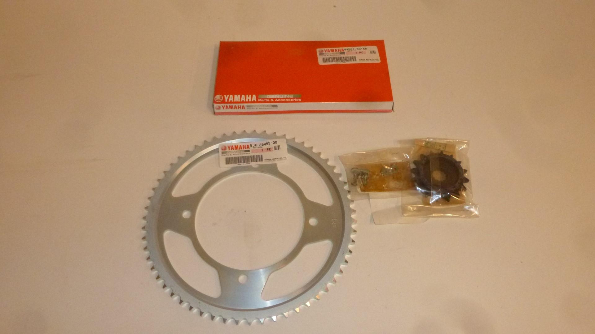 In dieser Auktion gibt es folgenden Artikel zu kaufen: Kettensatz (siehe Foto) Modell: passend für Yamaha XVS 125 Dragstar Bj.: 2000 - 2004 Details: Zähnezahl: 16x59 Vor dem Kauf bitte Übersetzung mit Ihrem Fahrzeug vergleichen! Lieferumfang: 1 x Kettenrad mit 59 Zähnen (5JX-25459-00) 1 x Kette (94581-90146) 1 x Ritzel mit 16 Zähnen (3RM-17460-00) 1 Kettenschloss (907AO-90002) Artikelzustand: neu aus Geschäftsauflösung, mit leichten Lagerspuren; Zustand siehe Foto Bei Unklarheiten oder Fragen bitte erst E-Mail schreiben.