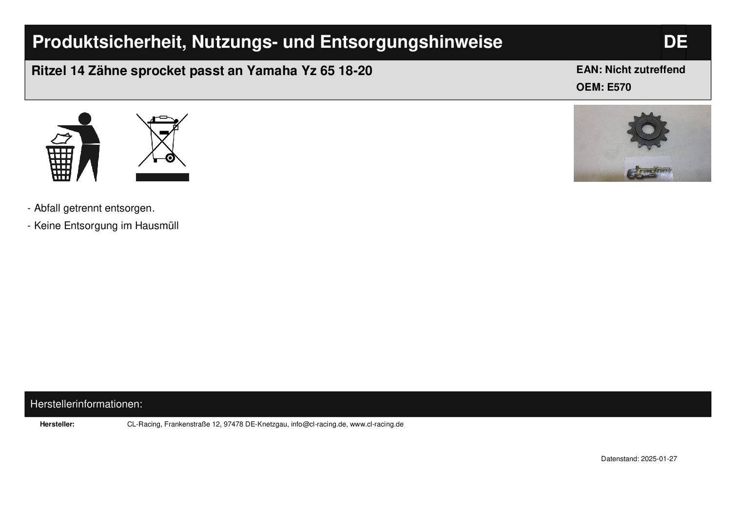 In dieser Auktion gibt es folgenden Artikel zu kaufen: Ritzel (siehe Foto) Modell: passend für Yamaha YZ 65 Bj.: 18 - 20 Zähnezahl: 14 Vor dem Kauf bitte Übersetzung mit Ihrem Fahrzeug vergleichen! Lieferumfang: 1 Stück Artikelzustand: neu Bei Unklarheiten oder Fragen bitte erst E-Mail schreiben.
