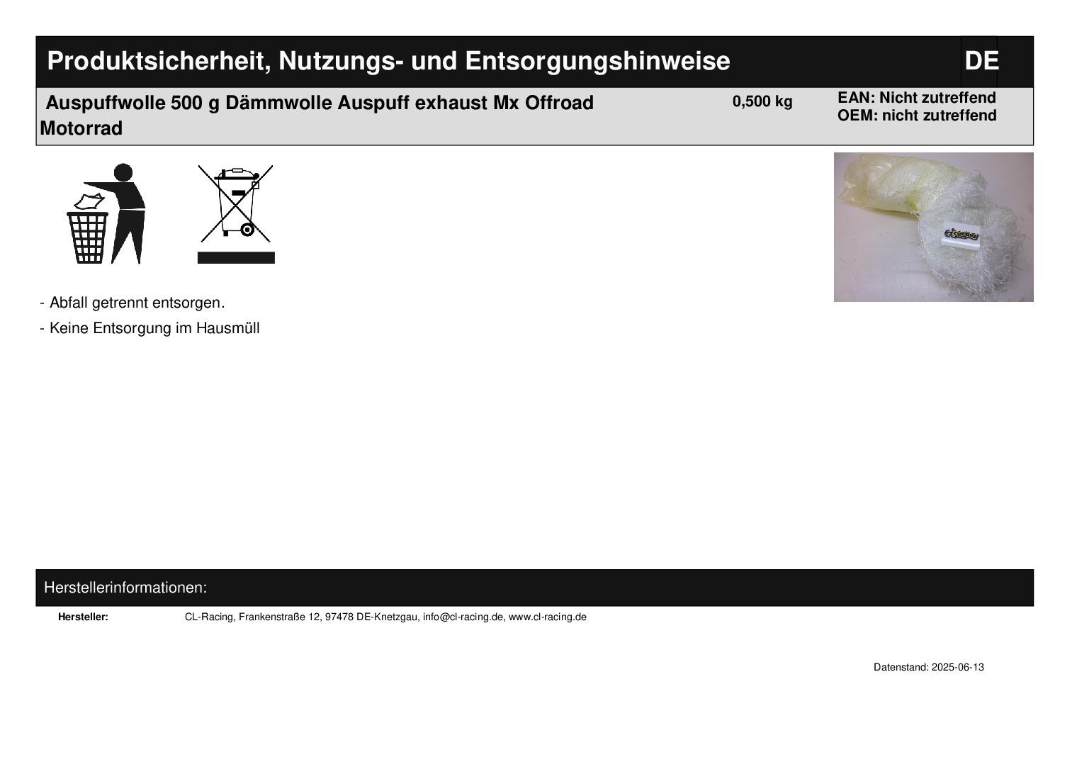 In dieser Auktion gibt es folgenden Artikel zu kaufen: 500g Sack Dämmwolle (siehe Foto) ohne Auspuff!!! Artikelbeschreibung: temperaturstabil bis 650° C Lieferumfang: 500 g Lieferung erfolgt selbstverständlich ohne Auspuff; dieser dient nur zur Veranschaulichung! Artikelzustand: neu Bei Unklarheiten oder Fragen bitte erst E-Mail schreiben.