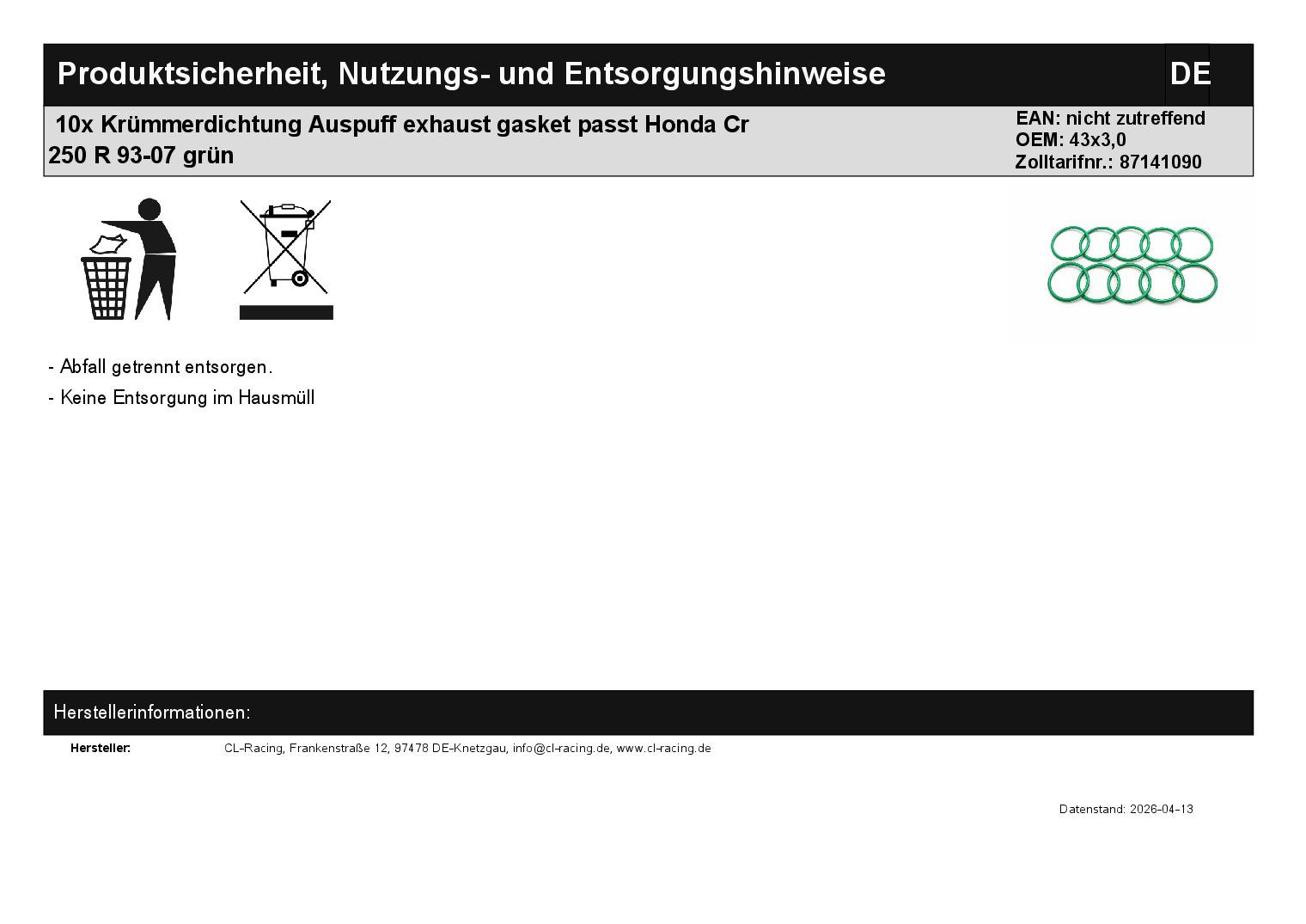 In dieser Auktion gibt es folgenden Artikel zu kaufen: Krümmerdichtungen (ähnlich Foto) Modell: passend für Honda CR 250 R Bj.: 1993 - 2007 Material: FMK (Viton) hitzebeständig Abmaße: 43 x 3,0 mm Lieferumfang: 10 Stück Artikelzustand: neu Es handelt sich hierbei um kein Originalteil! Bei Unklarheiten oder Fragen bitte erst E-Mail schreiben.