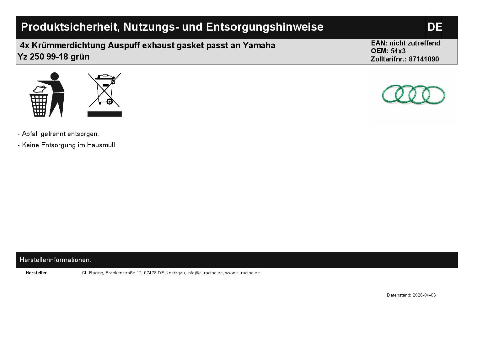 In dieser Auktion gibt es folgenden Artikel zu kaufen: Krümmerdichtungen (ähnlich Foto) Modell: passend für Yamaha YZ 250 Bj.: 1999 - 2018 Material: FMK (Viton) hitzebeständig Abmaße: 54 x 3,0 mm Lieferumfang: 4 Stück Artikelzustand: neu Es handelt sich hierbei um kein Originalteil! Bei Unklarheiten oder Fragen bitte erst E-Mail schreiben.