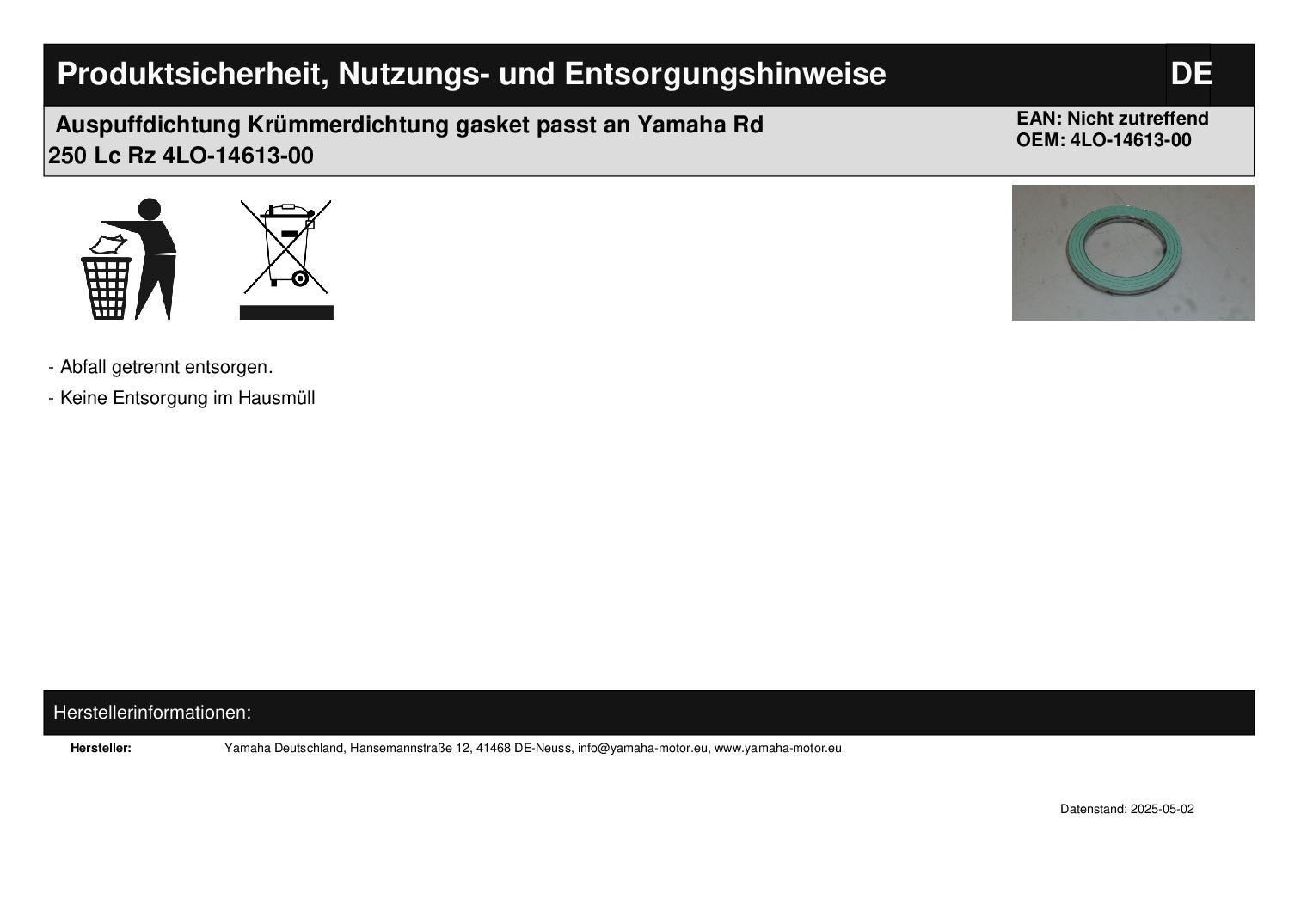 In dieser Auktion gibt es folgenden Artikel zu kaufen: Auspuffdichtung (siehe Foto) Modell: passend für Yamaha RD 250 LC Bj.: 80 - 86 RD 350 LC Bj.: 80 - 82 RZ 250, 350 LC Bj.: 80 - 82 Lieferumfang: 1 Stück Artikelzustand: neu aus Geschäftsauflösung, mit leichten Lagerspuren; Zustand siehe Foto Bei Unklarheiten oder Fragen bitte erst E-Mail schreiben.