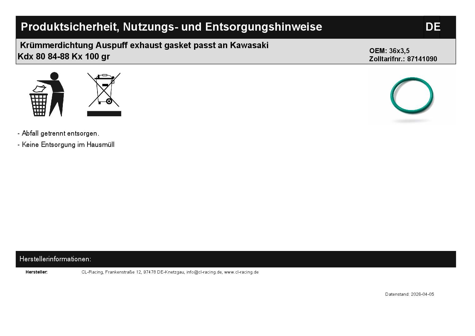 In dieser Auktion gibt es folgenden Artikel zu kaufen: Krümmerdichtungen (ähnlich Foto) Modell: passend für Kawasaki KDX 80 Bj.: 1984 - 1988 KX 80 Bj.: 1983 - 1997 KX 100 Bj.: 1995 - 1997 Material: FMK (Viton) hitzebeständig Abmaße: 36 x 3,5 mm Lieferumfang: 1 Stück Artikelzustand: neu Es handelt sich hierbei um kein Originalteil! Bei Unklarheiten oder Fragen bitte erst E-Mail schreiben.