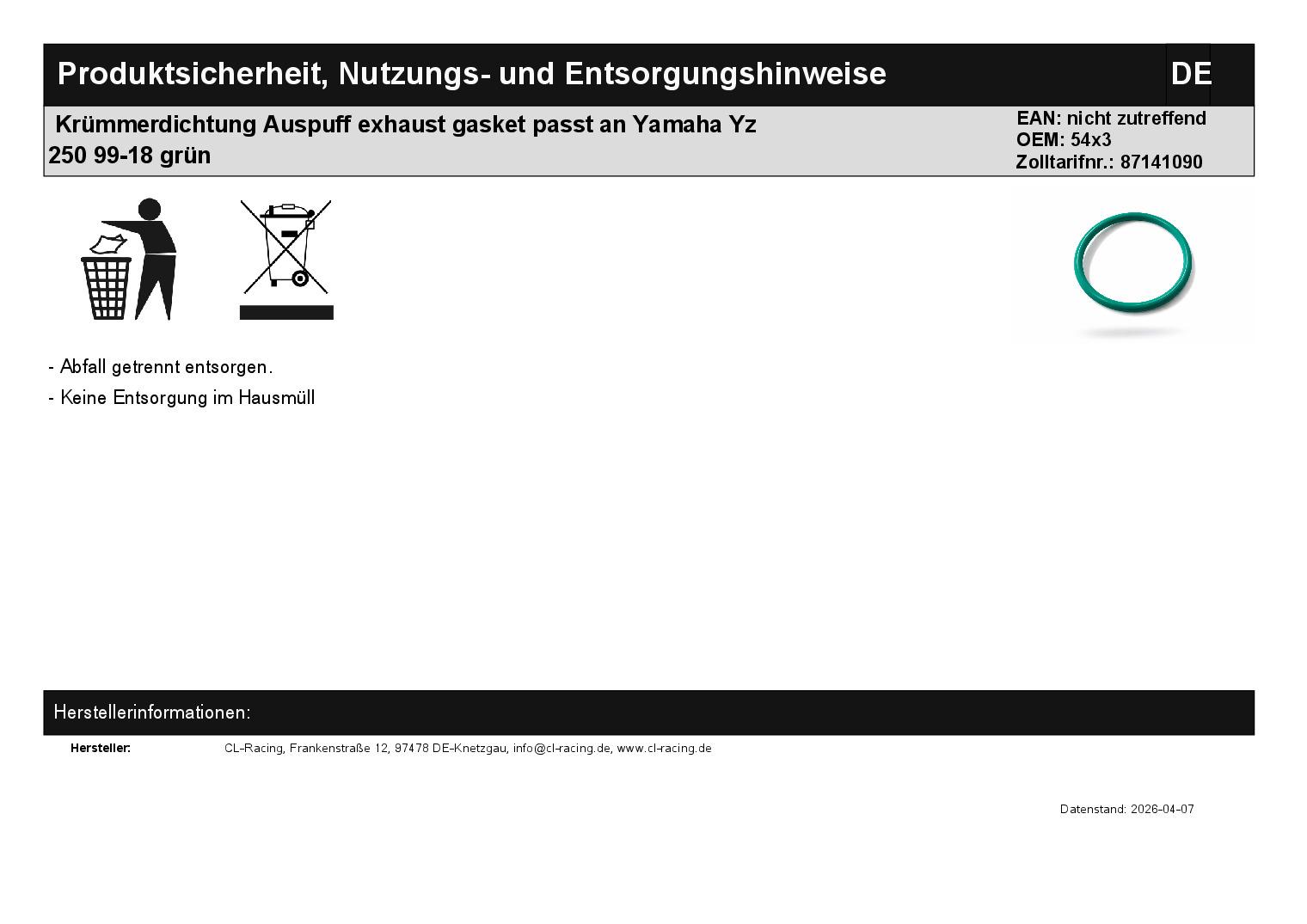 Titel: Krümmerdichtung Auspuff exhaust gasket passt an Yamaha Yz 250 99-18 grün