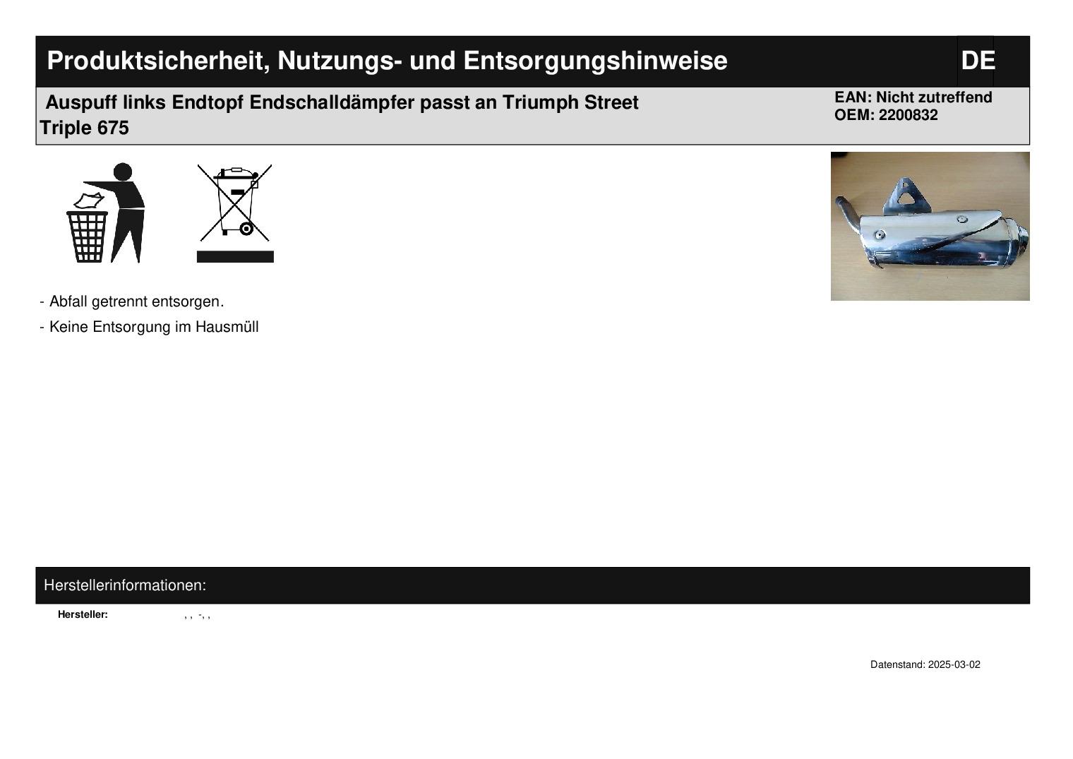 In dieser Auktion gibt es folgenden Artikel zu kaufen: originaler linker Auspuff (siehe Foto) Modell: passend für Triumph Street Triple 675 (4-Takt) Erstzulassung: 2010 (evtl. auch für andere Modelle, bitte vorher Fragen!) Teilenummer: 2200832 (steht auf der Innenseite) Lieferumfang: siehe Foto Artikelzustand: normale Gebrauchsspuren wie leichte Kratzer etc. vorhanden; Zustand siehe Foto Bei Unklarheiten oder Fragen bitte erst E-Mail schreiben.