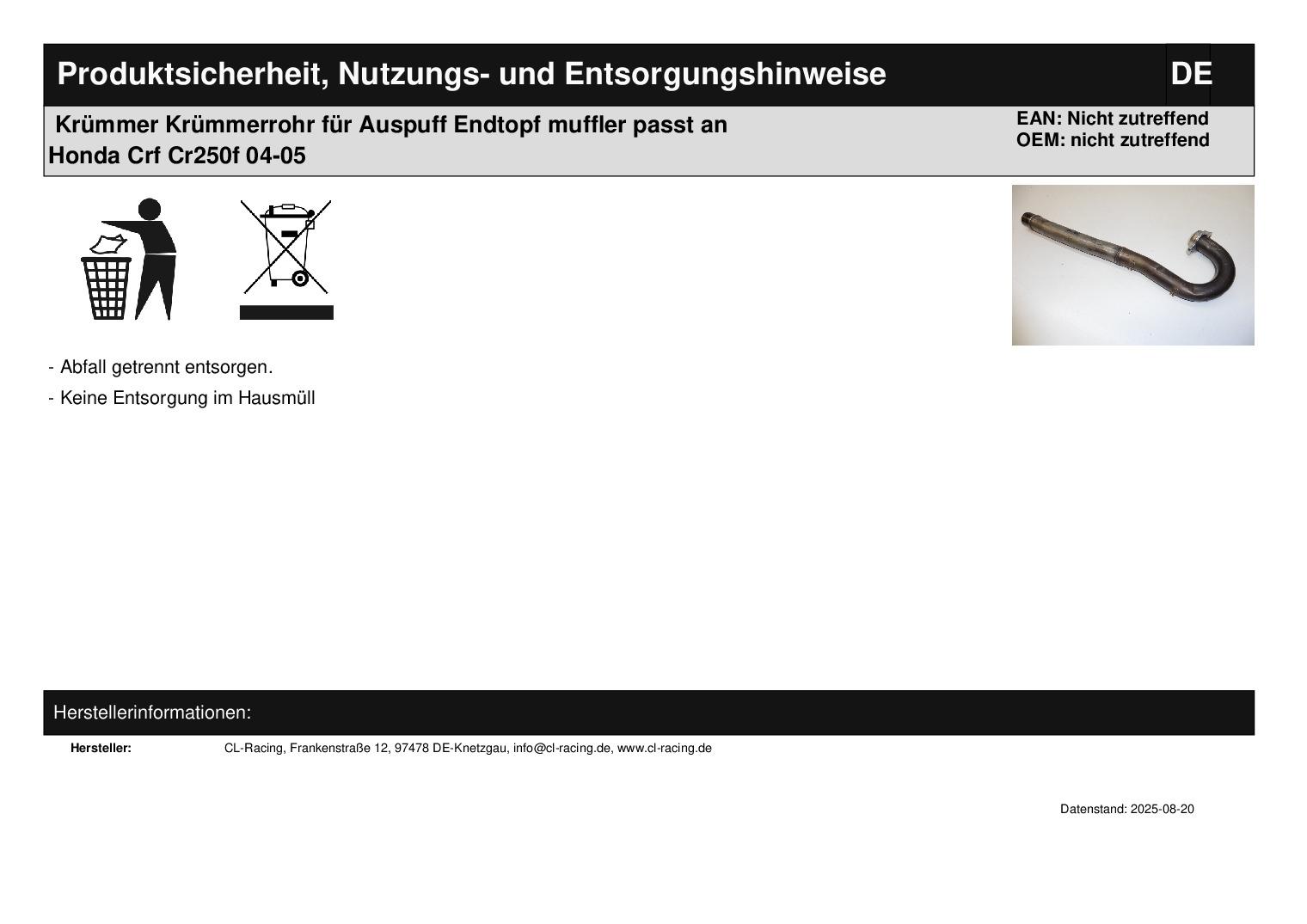 In dieser Auktion gibt es folgenden Artikel zu kaufen: Krümmer (siehe Foto) Modell: passend für Honda CRF 250 Bj.: 04 - 05 (4-Takt) Lieferumfang: siehe Foto Artikelzustand: Krümmer hat normale Gebrauchsspuren wie Kratzer und kleinere Dellen; Zustand siehe Foto Bei Unklarheiten oder Fragen bitte erst E-Mail schreiben.