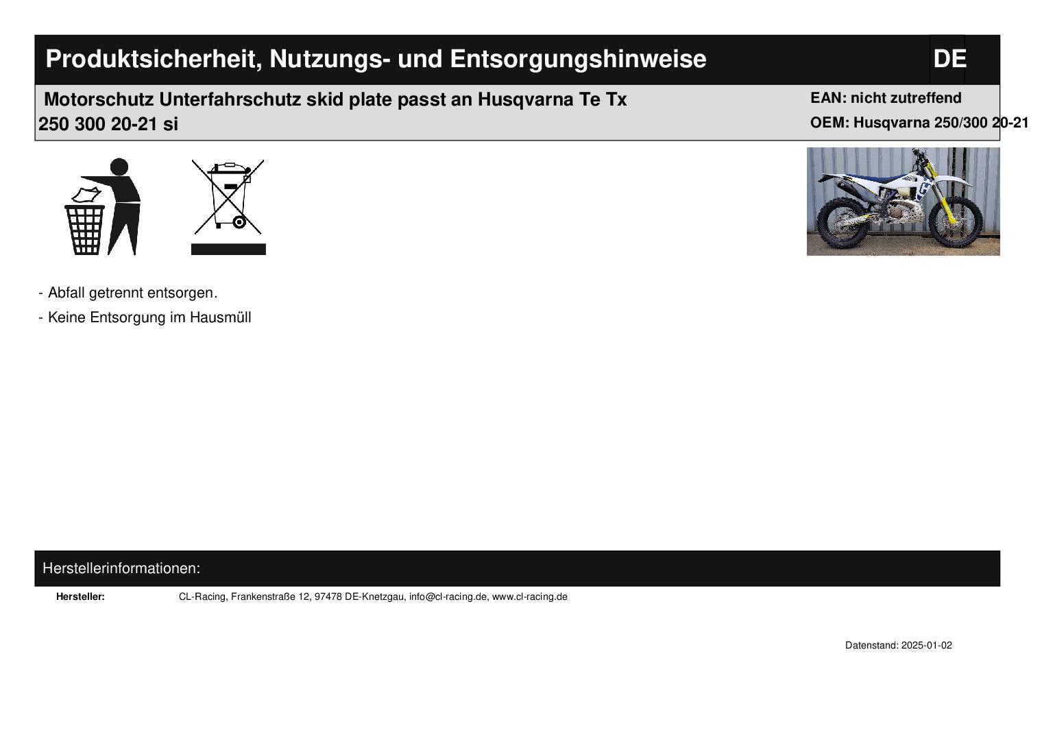 In dieser Auktion gibt es folgenden Artikel zu kaufen:   Motorschutz mit Krümmerschutz (siehe Foto) Modell: passend für Husqvarna Te Tx 250 300 Bj.: 2020 - 2021 (2-Takt) Artikelbeschreibung: Dieser Motor-/Krümmerprotektor schützt Unterboden und Krümmerbirne vor Beschädigungen. Details: Material: Aluminium 4 mm Gewicht: ca. 3 kg gute Passform und leichte Montage direkt am Hauptrahmen Wichtig: passend nur für originalen Krümmer, der noch nicht verzogen ist! Lieferumfang: Motorschutz mit Befestigungskit     Artikelzustand:  neu   Bei Unklarheiten oder Fragen bitte erst E-Mail schreiben.
