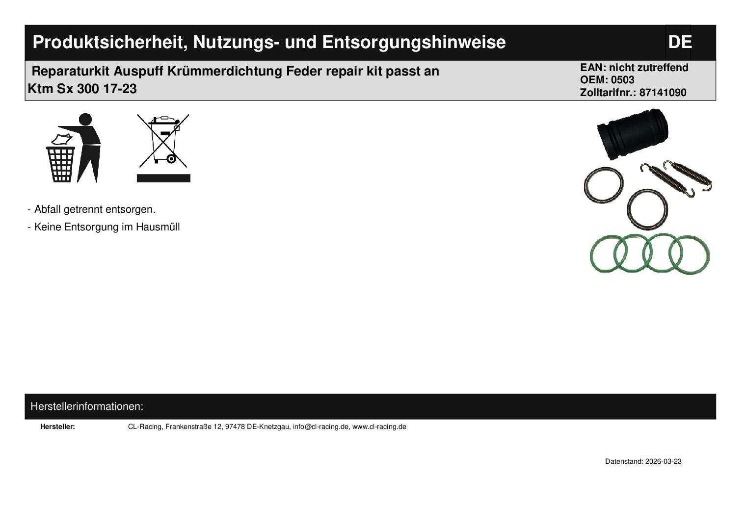 In dieser Auktion gibt es folgenden Artikel zu kaufen: Reparaturkit für Auspuff (siehe Foto) Modell: passend für Ktm Sx, Exc 250 Bj.: 2017 - 2023 (2-Takt) Sx, Exc 300 Bj.: 2017 - 2023 (2-Takt) passend für Husqvarna Mx Tc 250 Bj.: 2017 - 2023 (2-Takt) Te 250 Bj.: 2017 - 2023 (2-Takt) Te 300 Bj.: 2017 - 2023 (2-Takt) Tx 300 Bj.: 2017 - 2023 (2-Takt) passend für GasGas Ex 250 300 Bj.: 2021 - 2023 (2-Takt) Ec 250 300 Bj.: 2021 - 2023 (2-Takt) Mc 250 300 Bj.: 2021 - 2023 (2-Takt) Lieferumfang: 1 x Verbindungsstück Krümmer/Endtopf innen = Ø 30 bzw. Ø 28 mm 2 x Krümmerfeder Länge = ca. 65 mm 4x Viton Krümmerdichtung Artikelzustand: neu