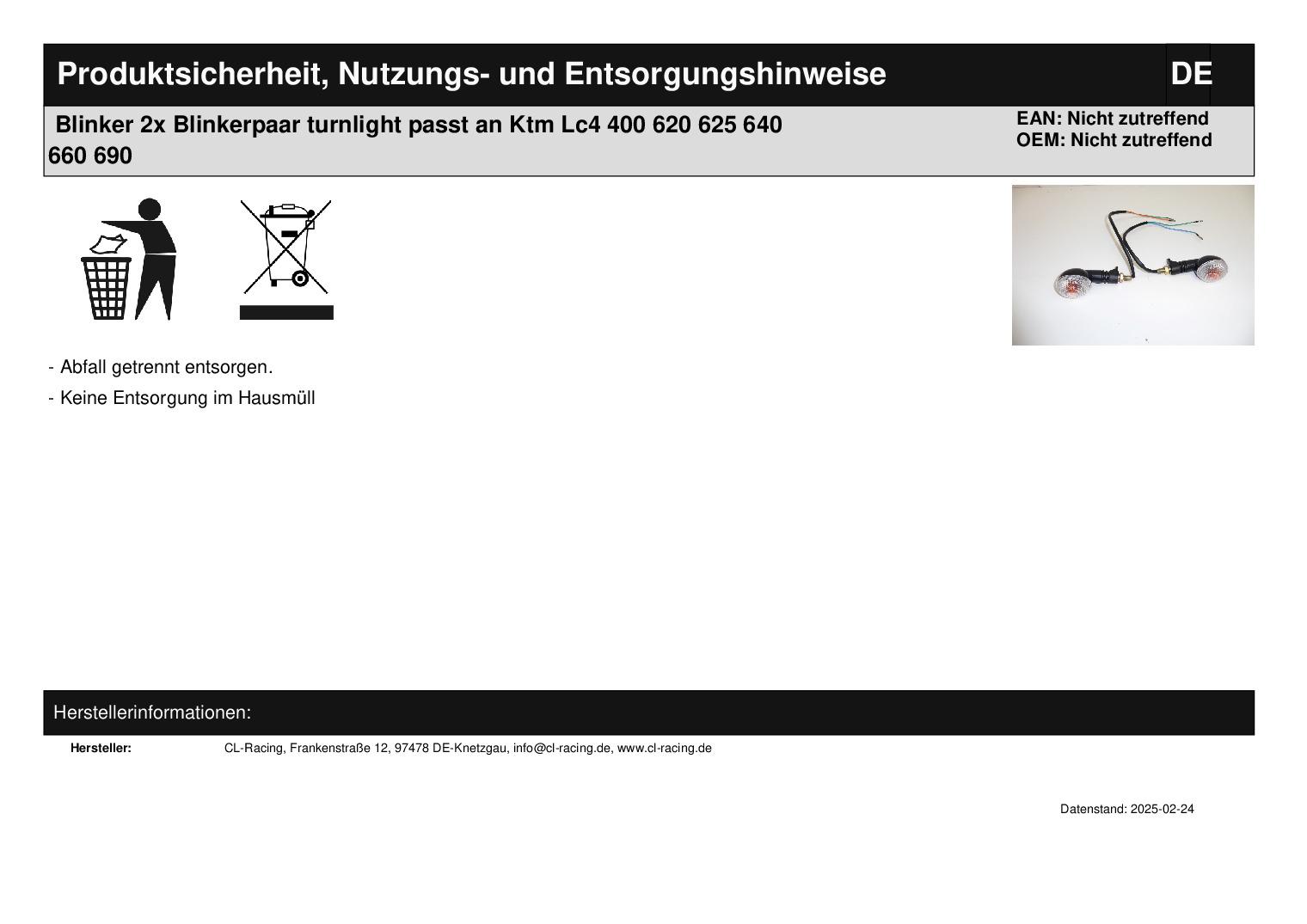 In dieser Auktion gibt es folgenden Artikel zu kaufen: Blinker (siehe Foto) Modell: passend für KTM EXC 125, 200 Bj.: 2011 – 2016 EXC 125 Sixdays Bj.: 2011 - 2016 EXC 150 Bj.: 2020 – 2025 EXC 250, 300 Bj.: 2011 – 2025 EXC 250, 300 Sixdays Bj.: 2011 - 2025 EXC 400, 530 Bj.: 2009 – 2011 EXC 450 Bj.: 2009 – 2016 EXC 450 Sixdays Bj.: 2009 - 2016 EXC 500 Bj.: 2012 – 2016 EXC 500 Sixdays Bj.: 2012 - 2016 EXC 530 Sixdays Bj.: 2009 - 2011 EXC-F 250 Bj.: 2011 – 2025 EXC-F 250 Sixdays Bj.: 2011 - 2025 EXC-F 350 Bj.: 2012 – 2025 EXC-F 350 Sixdays Bj.: 2012 - 2025 EXC-F 450, 500 Bj.: 2017 – 2025 EXC-F 450, 500 Sixdays Bj.: 2017 - 2025 ENDURO R 690 Bj.: 2011 – 2018 FREERIDE 250 F Bj.: 2018 – 2020 FREERIDE 250 R Bj.: 2014 – 2017 FREERIDE 350 Bj.: 2012 – 2017 FREERIDE E-XC Bj.: 2015 – 2023 passend für Husqvarna/Husaberg FE 250, 350, 501 Bj.: 2013 – 2025 FE 350 PRO Bj.: 2024 – 2025 FE 390, 570 Bj.: 2011 – 2012 FE 450 Bj.: 2011 – 2025 FS 570 Bj.: 2010 – 2011 TE 125 Bj.: 2012 – 2016 + 2025 TE 150 Bj.: 2020 – 2025 TE 250, 300 Bj.: 2011 – 2025 TE 300 PRO Bj.: 2024 – 2025 passend für GasGas EG 250, 300 Bj.: 2021 - 2025 EG 250F, 350F Bj.: 2021 - 2025 EG 450F, 500F Bj.: 2024 - 2025 TXT GP 250, 300 Bj.: 2023 – 2025 TXT RACING 125, 250, 280, 300 Bj.: 2023 – 2025 Abmaß e: Länge: ca. 90 mm Blinkerglas: ca. 50 x 40 mm Gewinde: M10 Kabellänge: ca. 10 cm Lieferumfang: 1 Paar Artikelzustand: neu Es handelt sich hierbei um kein Originalteil! Bei Unklarheiten oder Fragen bitte erst E-Mail schreiben.