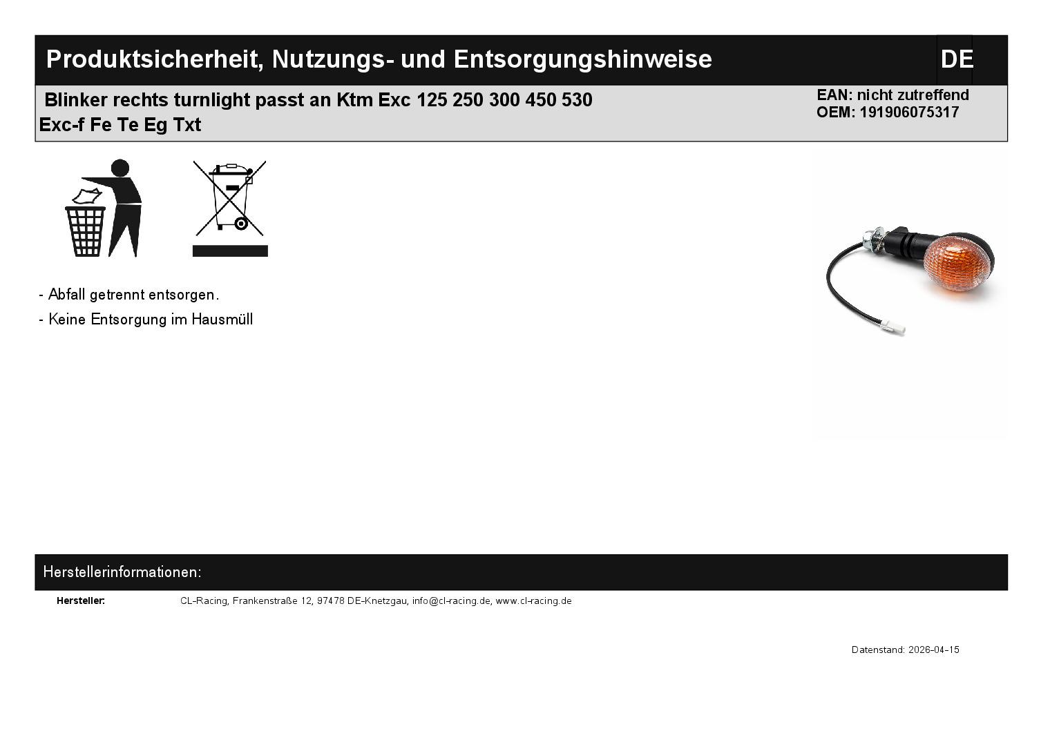 In dieser Auktion gibt es folgenden Artikel zu kaufen: 1 x Blinker vorne rechts bzw. hinten links (siehe Foto) passend für KTM EXC 125, 200 Bj.: 2011 – 2016 EXC 125 Sixdays Bj.: 2011 - 2016 EXC 150 Bj.: 2020 – 2025 EXC 250, 300 Bj.: 2011 – 2025 EXC 250, 300 Sixdays Bj.: 2011 - 2025 EXC 400, 530 Bj.: 2009 – 2011 EXC 450 Bj.: 2009 – 2016 EXC 450 Sixdays Bj.: 2009 - 2016 EXC 500 Bj.: 2012 – 2016 EXC 500 Sixdays Bj.: 2012 - 2016 EXC 530 Sixdays Bj.: 2009 - 2011 EXC-F 250 Bj.: 2011 – 2025 EXC-F 250 Sixdays Bj.: 2011 - 2025 EXC-F 350 Bj.: 2012 – 2025 EXC-F 350 Sixdays Bj.: 2012 - 2025 EXC-F 450, 500 Bj.: 2017 – 2025 EXC-F 450, 500 Sixdays Bj.: 2017 - 2025 ENDURO R 690 Bj.: 2011 – 2018 FREERIDE 250 F Bj.: 2018 – 2020 FREERIDE 250 R Bj.: 2014 – 2017 FREERIDE 350 Bj.: 2012 – 2017 FREERIDE E-XC Bj.: 2015 – 2023 passend für Husqvarna/Husaberg FE 250, 350, 501 Bj.: 2013 – 2025 FE 350 PRO Bj.: 2024 – 2025 FE 390, 570 Bj.: 2011 – 2012 FE 450 Bj.: 2011 – 2025 FS 570 Bj.: 2010 – 2011 TE 125 Bj.: 2012 – 2016 + 2025 TE 150 Bj.: 2020 – 2025 TE 250, 300 Bj.: 2011 – 2025 TE 300 PRO Bj.: 2024 – 2025 passend für GasGas EG 250, 300 Bj.: 2021 - 2025 EG 250F, 350F Bj.: 2021 - 2025 EG 450F, 500F Bj.: 2024 - 2025 TXT GP 250, 300 Bj.: 2023 – 2025 TXT RACING 125, 250, 280, 300 Bj.: 2023 – 2025 Abmaß e: Länge: ca. 90 mm Blinkerglas: ca. 50 x 40 mm Gewinde: M10 Kabellänge: ca. 10 cm Lieferumfang: 1 Stück vorne rechts bzw. hinten links Artikelzustand: neu Es handelt sich hierbei um kein Originalteil! Bei Unklarheiten oder Fragen bitte erst E-Mail schreiben.