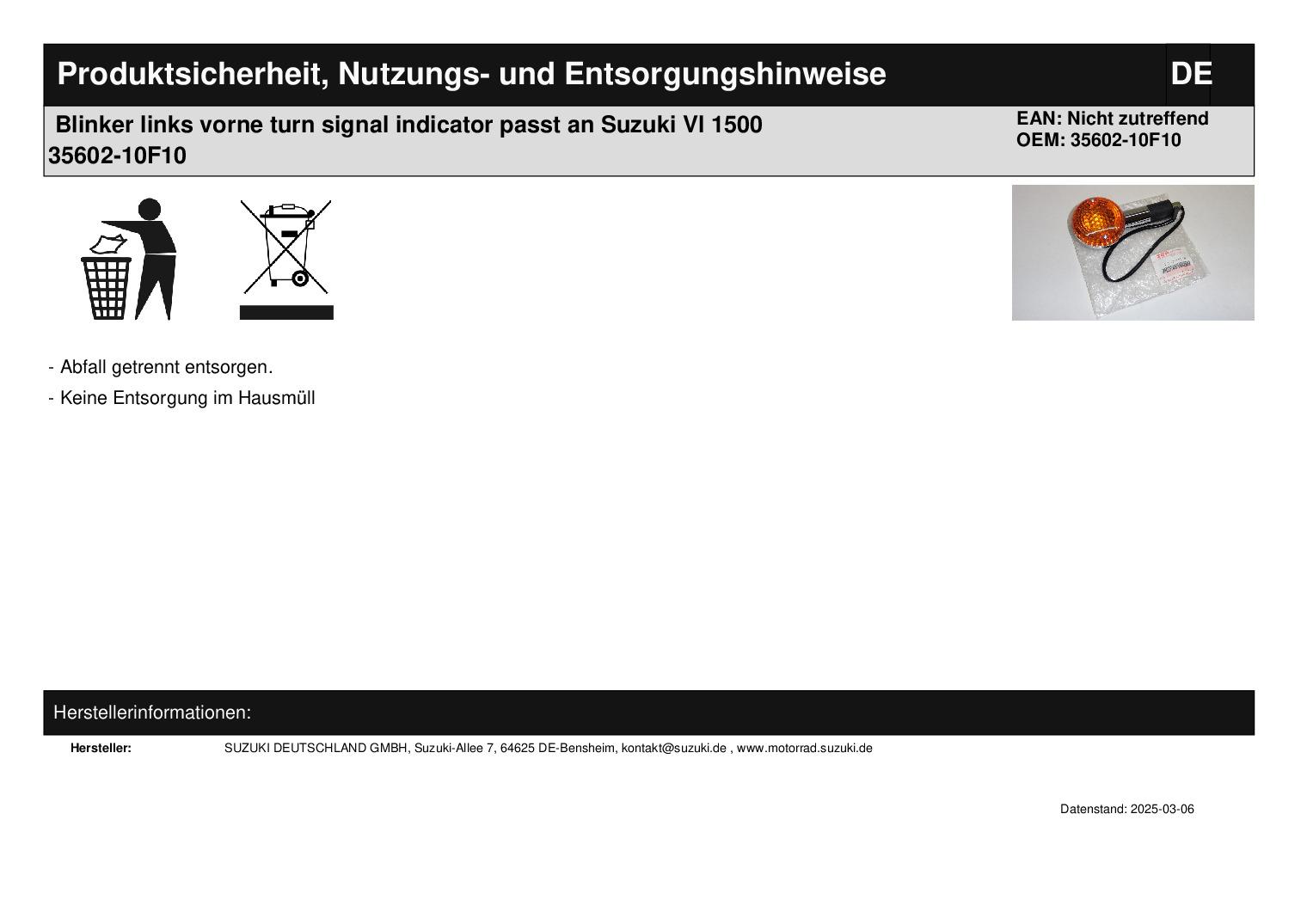 In dieser Auktion gibt es folgenden Artikel zu kaufen: Blinker (siehe Foto) Modell: passend für Suzuki VL 1500 Bj.: 1998 Lieferumfang: siehe Foto Artikelzustand: neu aus Geschäftsauflösung, mit minimalen Lagerspuren; Zustand siehe Foto Bei Unklarheiten oder Fragen bitte erst E-Mail schreiben.