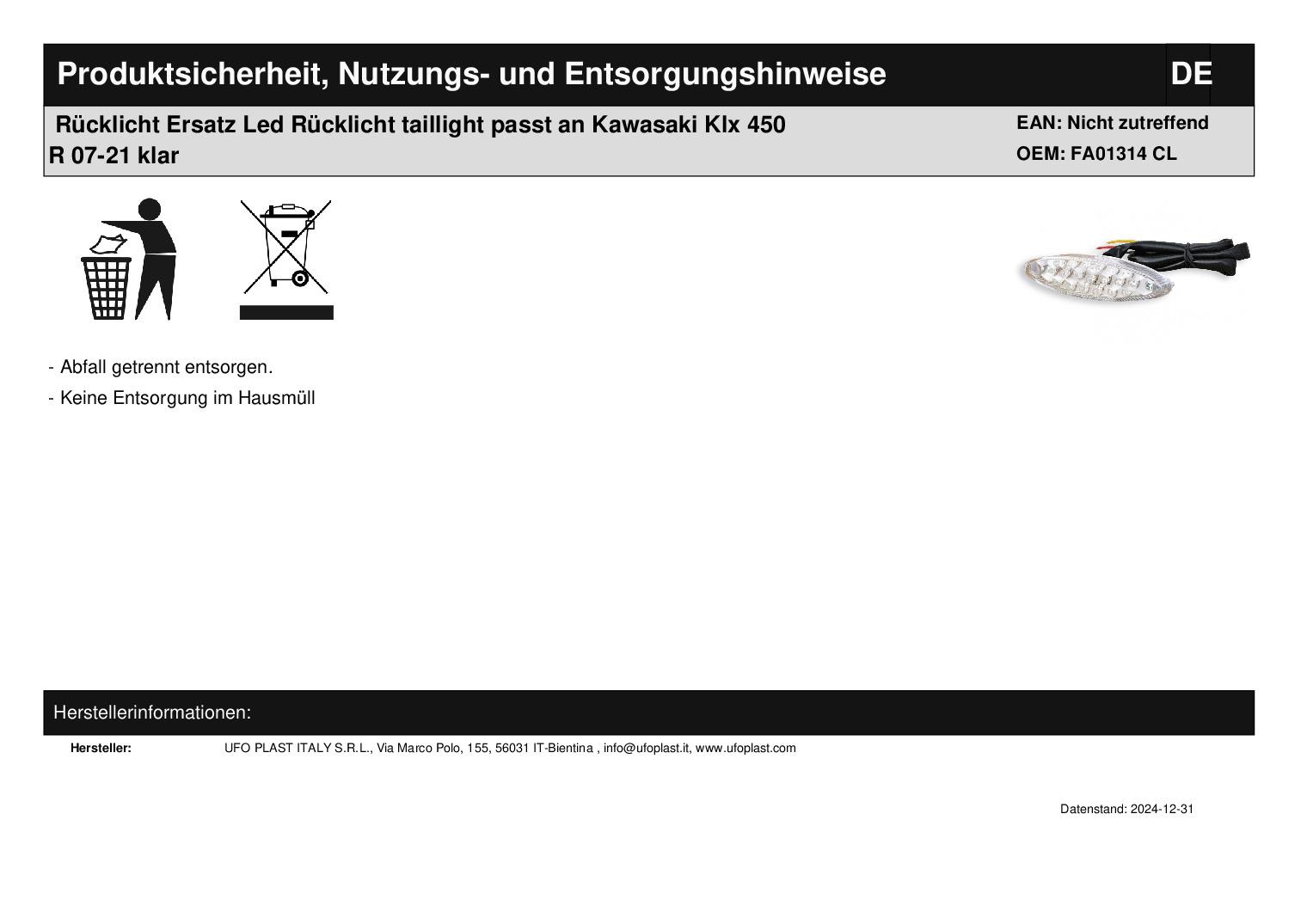 In dieser Auktion gibt es folgenden Artikel zu kaufen: Rücklicht (ähnlich Foto) Modell: passend für Kawasaki KLX 450 R Bj.: 07 - 21 passend für Ufo Kennzeichenhalter PP01219K-CL Lieferumfang: 1 Stück Artikelzustand: neu aus Geschäftsauflösung, mit leichten Lagerspuren; Zustand ähnlich Foto Bei Unklarheiten oder Fragen bitte erst E-Mail schreiben.