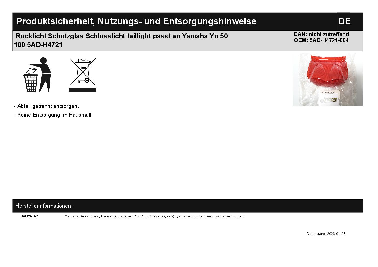 In dieser Auktion gibt es folgenden Artikel zu kaufen: Modell: passend für Yamaha YN 50 Bj.: 1997 - 2006 YN 100 Bj.: 2001 - 2003 Lieferumfang: siehe Foto Artikelzustand: neu aus Geschäftsauflösung, mit leichten Lagerspuren; Zustand siehe Foto Bei Unklarheiten oder Fragen bitte erst E-Mail schreiben.
