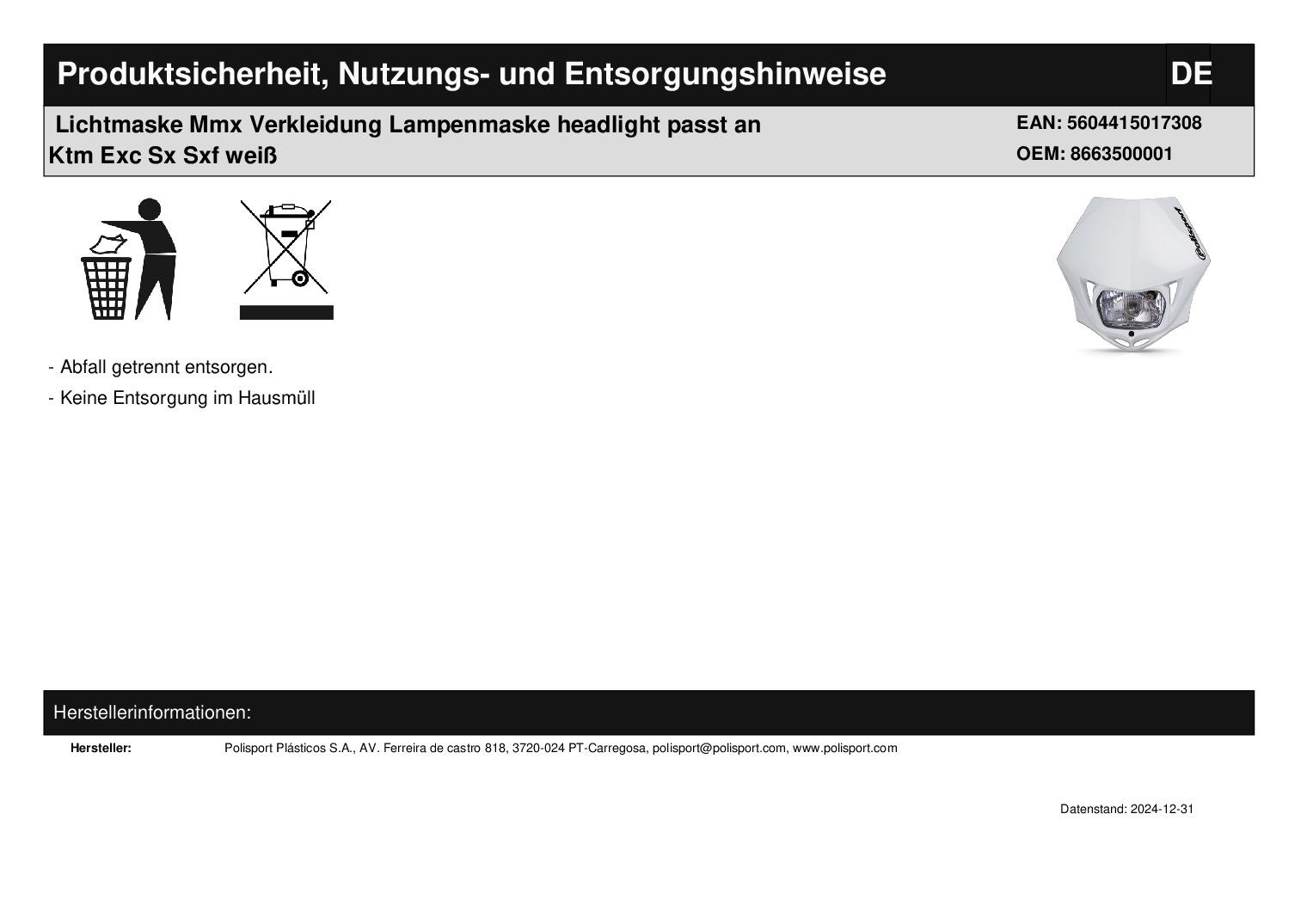 In dieser Auktion gibt es folgenden Artikel zu kaufen: Lichtmaske incl. Anbaukit und Leuchtmittel (siehe Foto) Hersteller: Polisport MMX Artikelbeschreibung: Es handelt sich hier um eine universal einsetzbare Lichtmaske, d. h. es kann sein, dass kleinere Veränderungen am Fahrzeug nötig sind, um das Teil zu montieren! universelle Scheinwerfermaske MMX; produziert mit DGP (Durable Gloss Polypropylene) Diese Kunststoff-Komposition ermöglicht ein Maximum an Glanz und Stabilität. - erfüllt ECE-, SAE- und DOT-Standards - Lampen: 1 x 12 V 35 W (S2; Sockel BA20d) für Fern- und Abblendlicht und 1 x 12 V 4 W (Sockel BA9s) für Standlicht - universelles Befestigungssystem - hohe Schlagfestigkeit - Klarglas-Optik - inklusive Haltegummis - inklusive Halterung für Lampenmaske (erhöht die Distanz zwischen Maske und Gabel zwischen 20 und 40 mm) Lieferumfang: siehe Foto Artikelzustand: neu Es handelt sich hierbei um kein Originalteil Bei Unklarheiten oder Fragen bitte erst E-Mail schreiben.