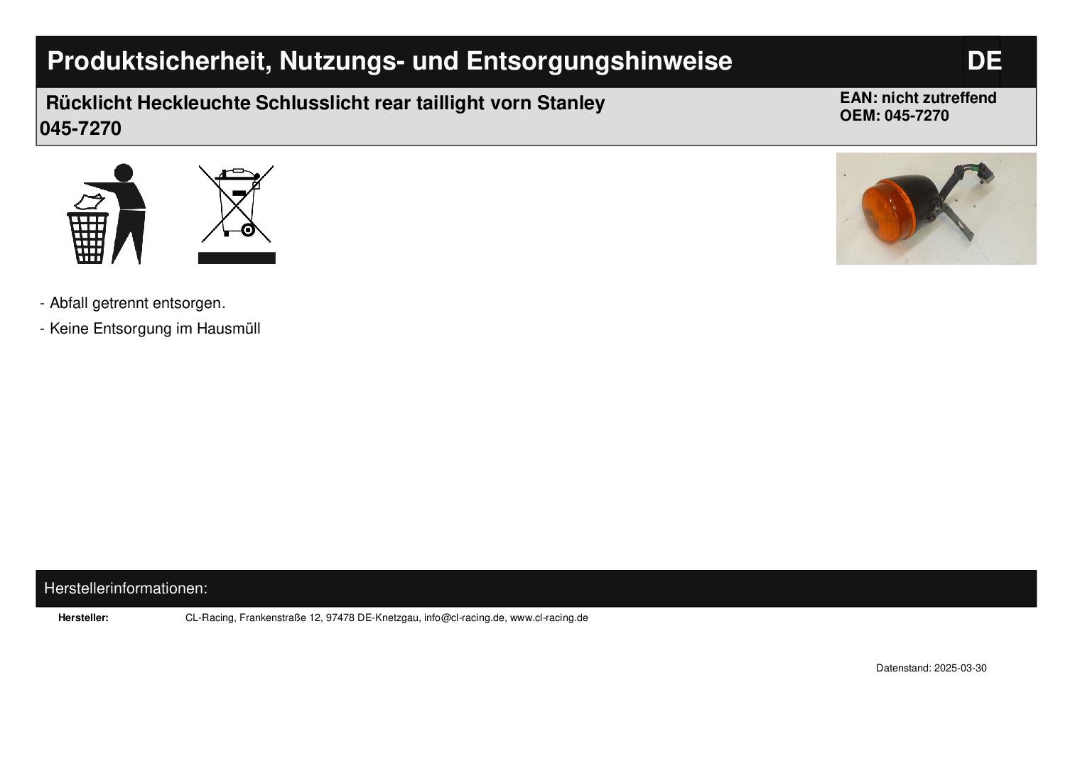 In dieser Auktion gibt es folgenden Artikel zu kaufen: Blinker (siehe Foto) Modell: unbekannt Bj.: unbekannt Details: STANLEY 045-7270 steht auf dem Rücklicht Abmaße: Durchmesser gesamt: ca. 5,1 cm Länge gesamt (ohne Halterung und Kabel): ca. 5,6 cm Bitte vor dem Kauf vergleichen! Lieferumfang: 1 Stück Artikelzustand: neu aus Geschäftsauflösung, mit leichten Lagerspuren; Zustand siehe Foto Bei Unklarheiten oder Fragen bitte erst E-Mail schreiben.