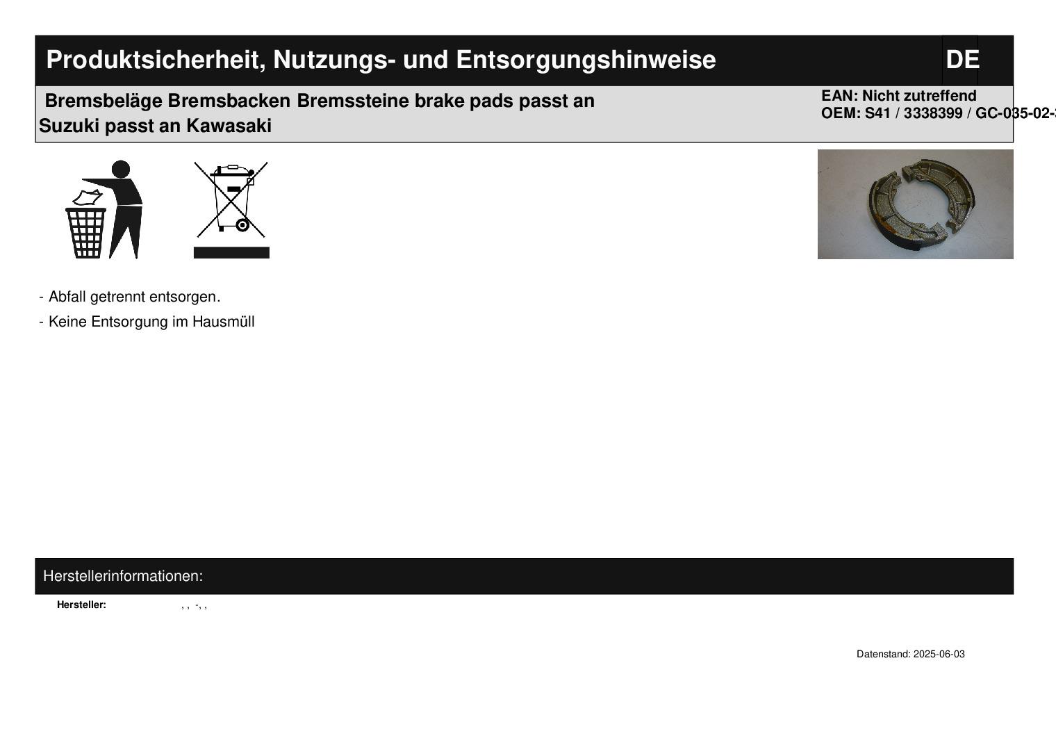 In dieser Auktion gibt es folgenden Artikel zu kaufen: Bremsbeläge (ähnlich Foto) Modell: passend für Suzuki / passend für Kawasaki RM / TS / GS / RG / GT / KH Bj.: unbekannt Details: Breite gesamt: ca. 29 mm Lieferumfang: 1 Paar Artikelzustand: neu aus Geschäftsauflösung, mit minimalen Lagerspuren; Zustand ähnlich Foto Bei Unklarheiten oder Fragen bitte erst E-Mail schreiben.