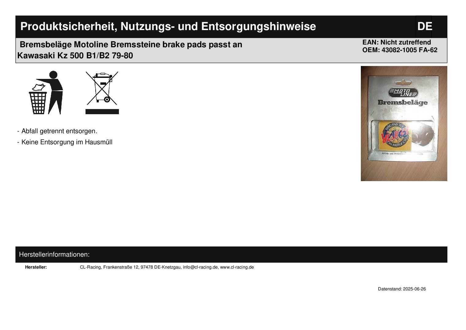 In dieser Auktion gibt es folgenden Artikel zu kaufen: Bremsbeläge (siehe Foto) Hersteller: Motoline Modell: passend für Kawasaki KZ 500 B1/B2 Bj.: 79 - 80 vorne Kawasaki-baugleich EBC FA 62 Lieferumfang: siehe Foto Artikelzustand: neu aus Geschäftsauflösung, mit leichten Lagerspuren; Zustand siehe Foto Bei Unklarheiten oder Fragen bitte erst E-Mail schreiben.