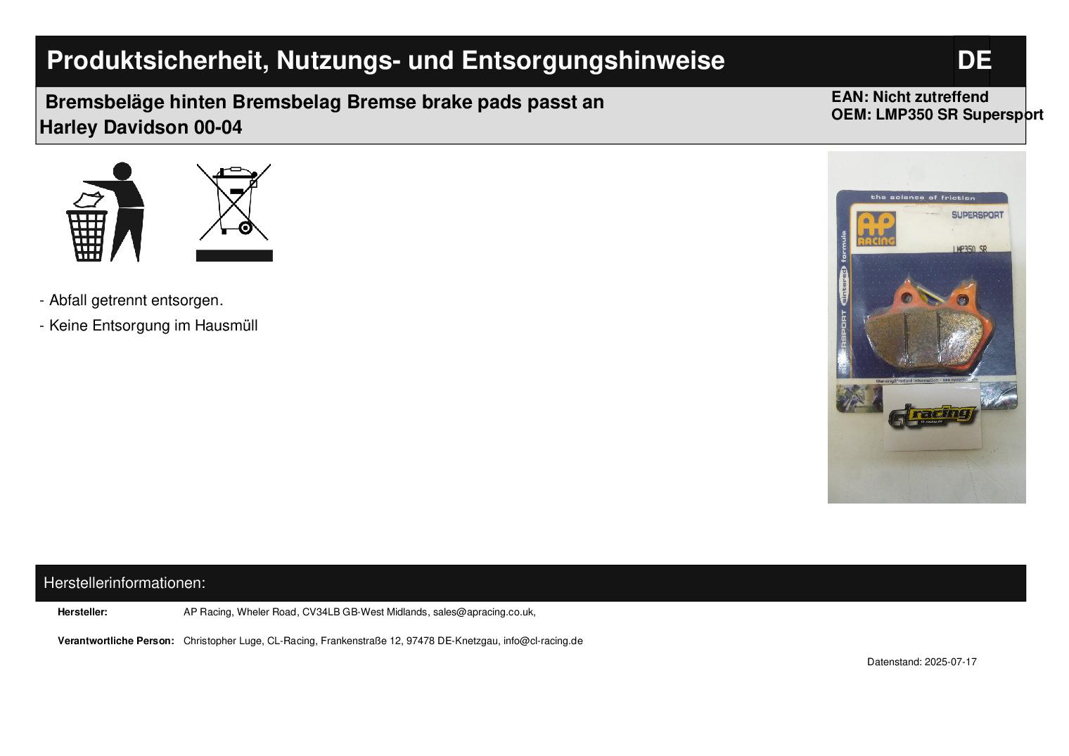 In dieser Auktion gibt es folgenden Artikel zu kaufen: Bremsbeläge hinten (siehe Foto) Modell: passend für Harley Davidson alle Modelle Bj.: 00 - 04 Lieferumfang: 1 Paar Artikelzustand: neu Bei Unklarheiten oder Fragen bitte erst E-Mail schreiben.