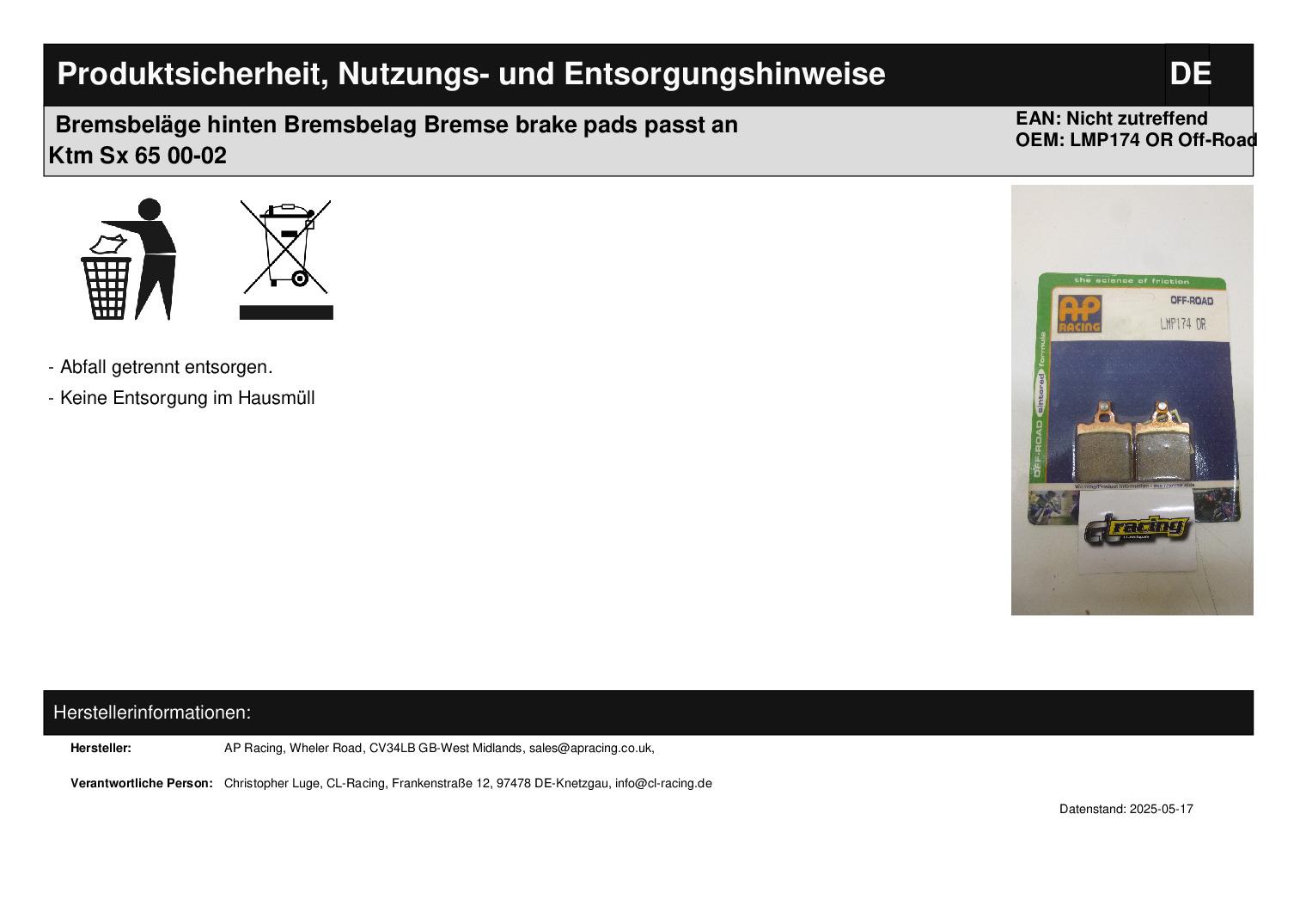 Titel: Bremsbeläge hinten Bremsbelag Bremse brake pads passt an Ktm Sx 65 00-02