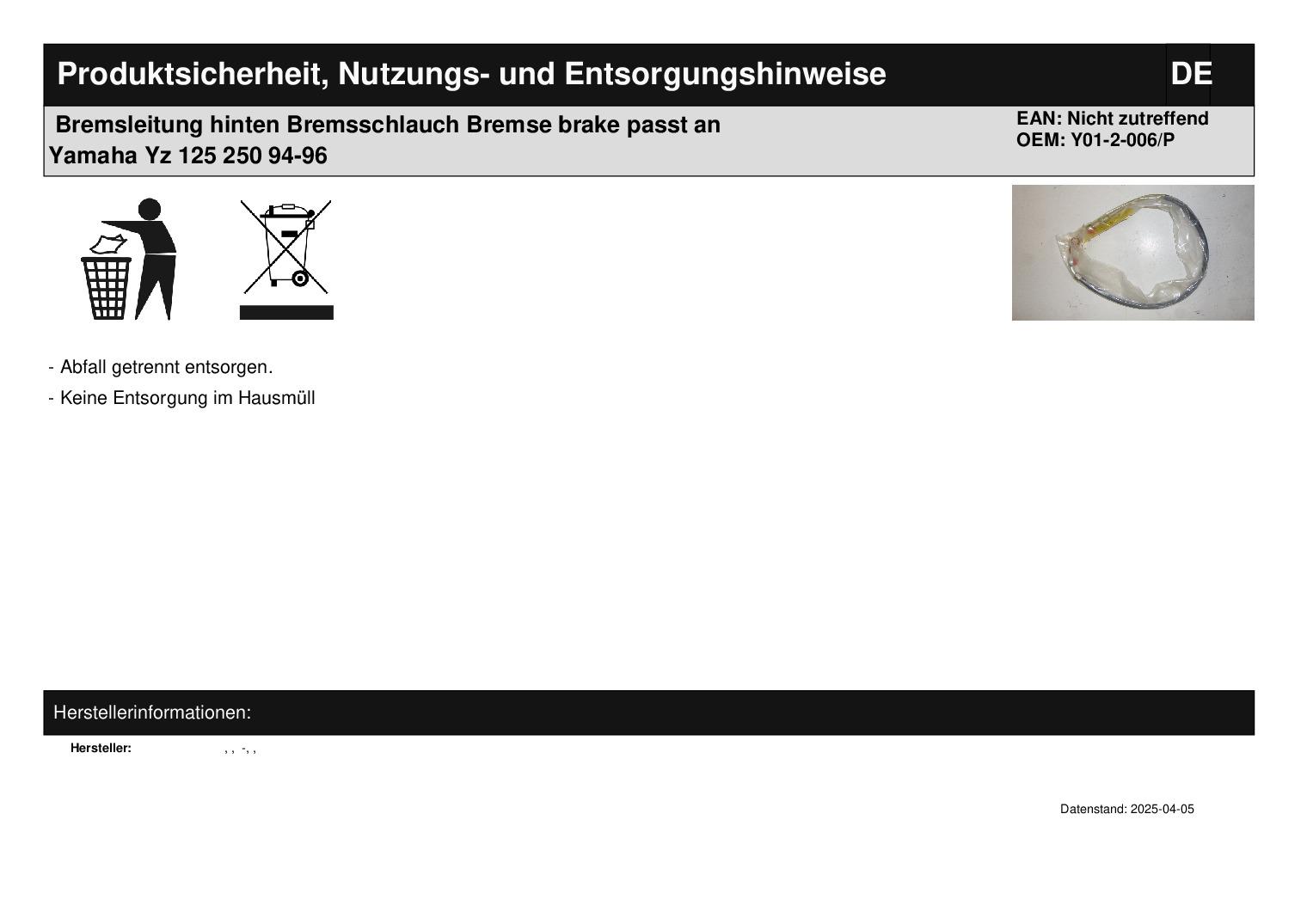 In dieser Auktion gibt es folgenden Artikel zu kaufen: Bremsleitung hinten (siehe Foto) Modell: passend für Yamaha YZ 125, 250 F/G/H Bj.: 94 - 96 Lieferumfang: siehe Foto Artikelzustand: neu aus Geschäftsauflösung, mit leichten Lagerspuren; Zustand siehe Foto Bei Unklarheiten oder Fragen bitte erst E-Mail schreiben.