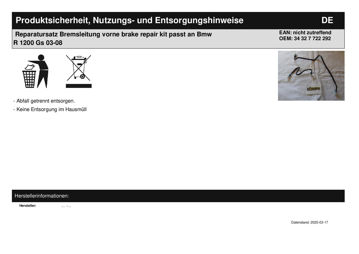 In dieser Auktion gibt es folgenden Artikel zu kaufen: Reparatursatz Bremsleitung vorne (siehe Foto) Modell: passend für BMW R 1200 GS Bj.: 2003 - 2008 Lieferumfang: siehe Foto Artikelzustand: neu aus Geschäftsauflösung, mit leichten Lagerspuren; Zustand siehe Foto