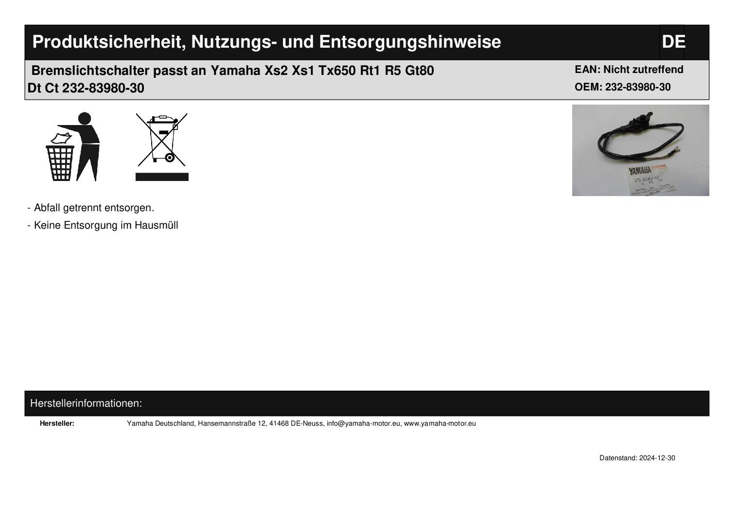 In dieser Auktion gibt es folgenden Artikel zu kaufen: Modell: passend für Yamaha 1968 YG5T HANDLE & WIRE 1969 AS2C HANDLE & WIRE 1969 AT1E HANDLE & WIRE 1969 AT1M HANDLE & WIRE 1969 CT1 HANDLE - WIRE 1969 DS6C HANDLE & WIRE 1969 DT1B HANDLE & WIRE 1969 DT1S HANDLE & WIRE 1969 L5T HANDLE & WIRE 1969 R3 HANDLE AND WIRE 1969 YG5S HANDLE & WIRE 1970 AT1B HANDLE & WIRE 1970 AT1MB HANDLE & WIRE 1970 ATM1B HANDLE & WIRE 1970 CT1B HANDLE & WIRE 1970 DS6B HANDLE & WIRE 1970 DT1C HANDLE & WIRE 1970 DT1CMX HANDLE & WIRE 1970 G6S HANDLE - WIRE 1970 HS1 HANDLE & WIRE 1970 HT1 HANDLE & WIRE 1970 L5TA HANDLE & WIRE 1970 R5 HANDLEBAR - CABLE 1970 RT1 HANDLE & WIRE 1970 RT1M HANDLE & WIRE 1970 XS1 HANDLE - WIRE 1971 AT1C HANDLE & WIRE 1971 AT1MX HANDLE & WIRE 1971 CS3B HANDLE & WIRE 1971 CS3C HANDLE & WIRE 1971 CT1C HANDLE & WIRE 1971 DT1E HANDLE & WIRE 1971 DT1MX HANDLE & WIRE 1971 G6SB HANDLE - WIRE 1971 HS1B HANDLE & WIRE 1971 HT1B HANDLE & WIRE 1971 HT1BM HANDLE & WIRE 1971 R5B HANDLEBAR - CABLE 1971 RT1B HANDLE & WIRE 1971 RT1MX HANDLE & WIRE 1971 XS1B HANDLE - WIRE 1972 AT2 HANDLE WIRE 1972 CS5 HANDLE - WIRE 1972 CT2 HANDLE WIRE 1972 DS7 HANDLE - WIRE 1972 DT2 HANDLE - WIRE 1972 DT2 HANDLE WIRE 1972 G7S HANDLE - WIRE 1972 JT2 HANDLE - WIRE 1972 JT2MX HANDLE - WIRE 1972 LS2 HANDLE - WIRE 1972 R5C HANDLEBAR - CABLE 1972 RT2 HANDLE - WIRE 1972 RT2 HANDLE WIRE 1972 XS2 HANDLE - WIRE 1973 AT3 HANDLE WIRE 1973 CT3 HANDLE WIRE 1973 DT3 HANDLE - WIRE 1973 DT3 HANDLE WIRE 1973 GT1 HANDLE - WIRE 1973 GTMX HANDLE - WIRE 1973 RD60 HANDLE - WIRE 1973 RT3 HANDLE - WIRE 1973 RT3 HANDLE WIRE 1973 TX650 HANDLE - WIRE 1974 GT80A HANDLE - WIRE 1974 GTMXA HANDLE - WIRE 1974 RD60A HANDLE - WIRE 1975 GT80B HANDLE - WIRE 1975 GT80MXB HANDLE - WIRE 1975 GTMXB HANDLE-WIRE 1975 RD60B HANDLE - WIRE 1976 GT80C HANDLE - WIRE 1976 GTMXC HANDLE - WIRE 1978 GT80E HANDLEBAR - CABLE GT80E - GT80E-009161 - GT80F 1979 GT80F HANDLEBAR - CABLE GT80E - GT80E-009161 - GT80F 1980 GT80G ELECTRICAL 2 GT80G 1981 DT80H ELECTRICAL - 2 DT80H 1982 DT80J HANDLE SWITCH - LEVER DT80J - K Lieferumfang: 1 Stück Artikelzustand: neu aus Geschäftsauflösung, mit minimalen Lagerspuren; Zustand siehe Foto Bei Unklarheiten oder Fragen bitte erst E-Mail schreiben.