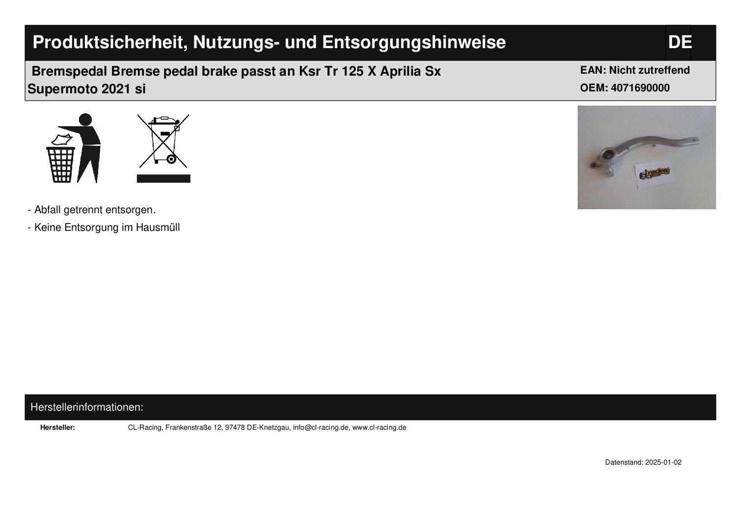 In dieser Auktion gibt es folgenden Artikel zu kaufen: Bremspedal (siehe Foto) Hersteller: KSR-Moto Modell: passend für KSR TR 125 X Bj.: 21 Aprilia SX 125 Supermoto Bj.: 21 Lieferumfang: siehe Foto Artikelzustand: normale Gebrauchsspuren wie Kratzer vorhanden; Zustand siehe Foto Bei Unklarheiten oder Fragen bitte erst E-Mail schreiben.