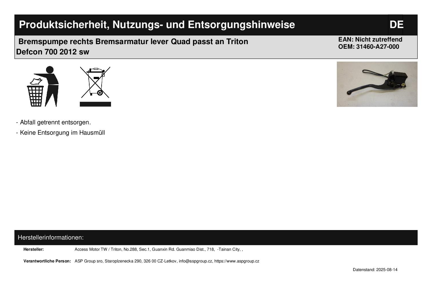 In dieser Auktion gibt es folgenden Artikel zu kaufen: Bremspumpe (siehe Foto) Modell: passend für Triton Defcon 700 EFI 4 x 4 LOF Bj.: 12 Outback 700 EFI 4 x 4 Bj.: 12 Lieferumfang: siehe Foto Artikelzustand: neu aus Geschäftsauflösung, mit leichten Lagerspuren; Zustand siehe Foto Bei Unklarheiten oder Fragen bitte erst E-Mail schreiben.