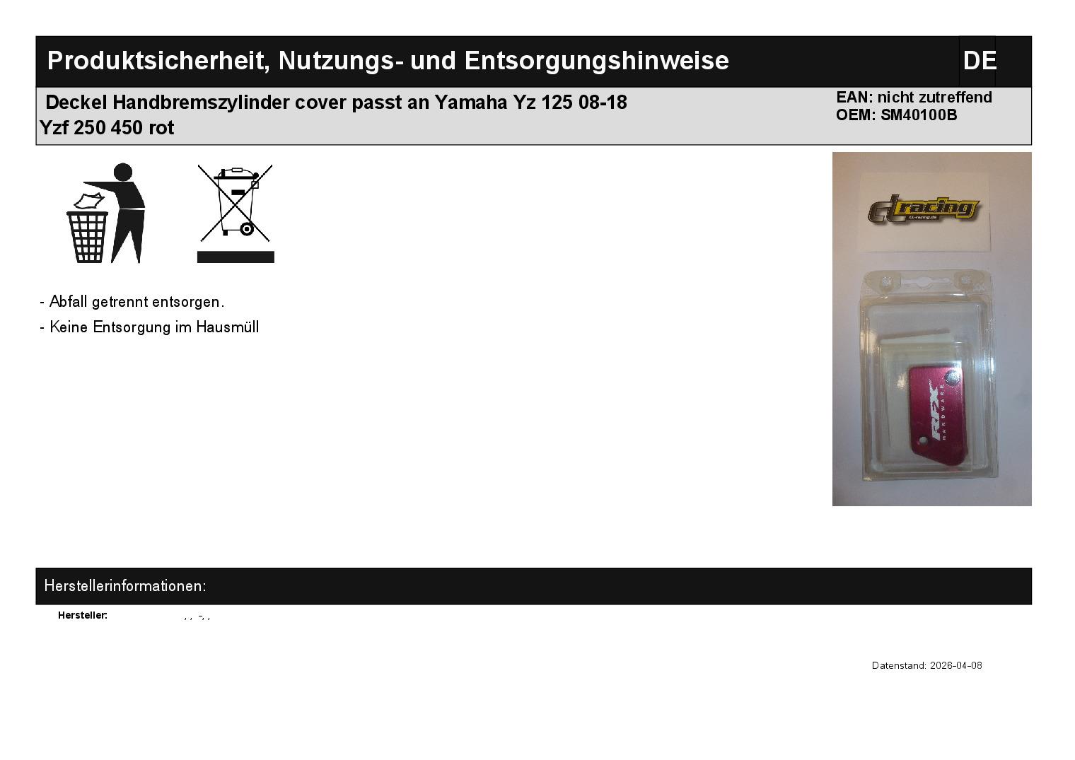 Titel: Deckel Handbremszylinder cover passt an Yamaha Yz 125 08-18 Yzf 250 450 rot