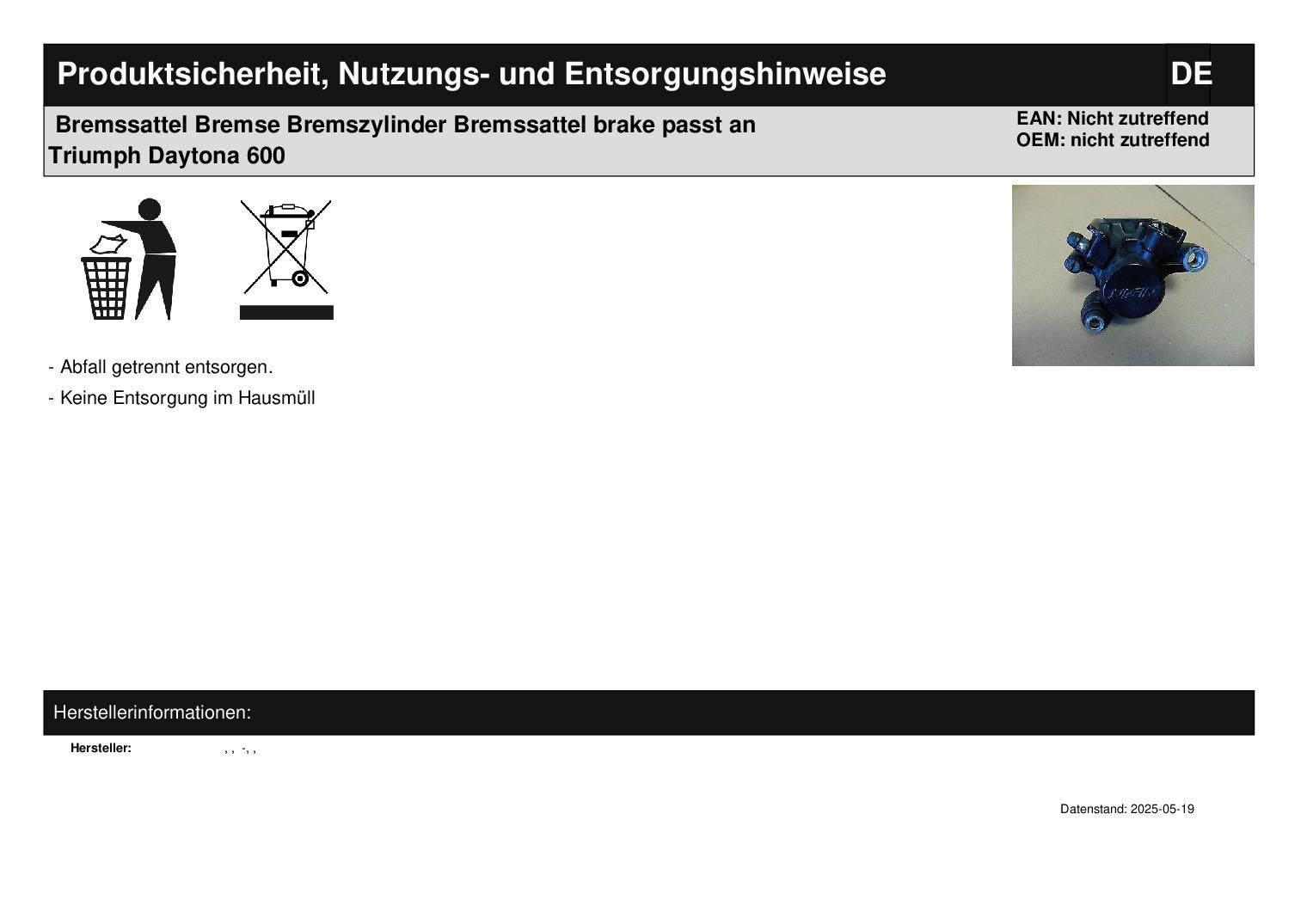 In dieser Auktion gibt es folgenden Artikel zu kaufen: Bremssattel (siehe Foto) Fahrzeug: passend für Triumph Daytona 600 Erstzulassung: 03.2005 (passt evtl. auch für andere Modelle, bitte erst nachfragen!) Lieferumfang: siehe Foto Artikelzustand: normale Gebrauchsspuren vorhanden; hat bis zur Demontage problemlos funktioniert; Zustand siehe Foto Bei Unklarheiten oder Fragen bitte erst E-Mail schreiben.