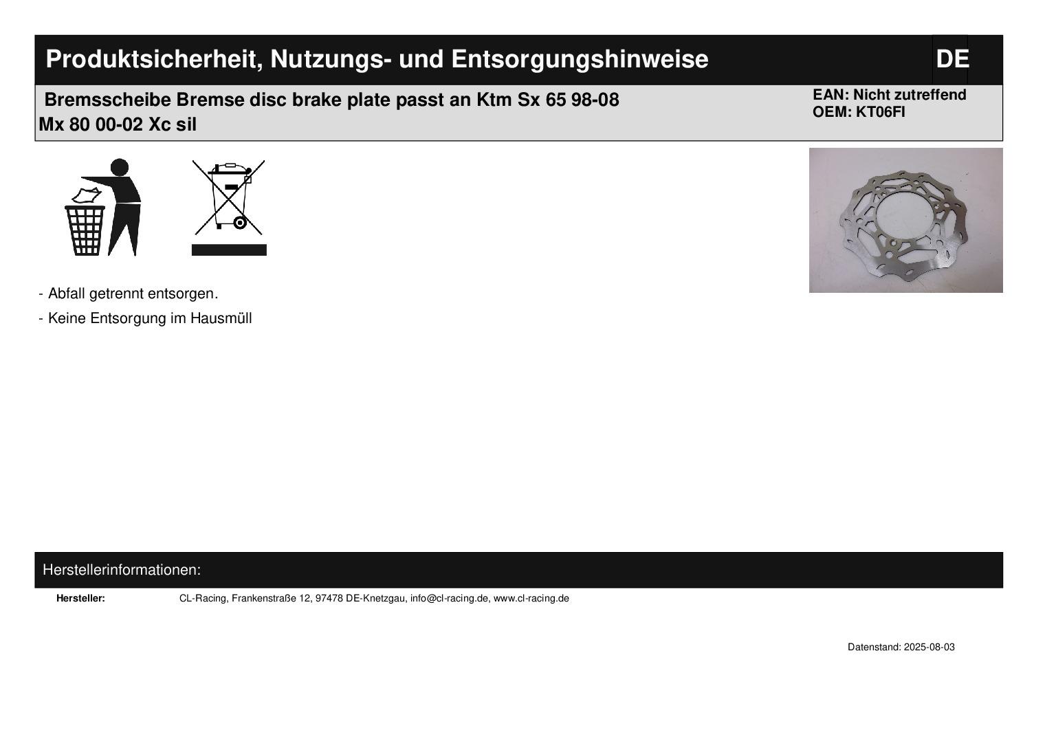 In dieser Auktion gibt es folgenden Artikel zu kaufen: Bremsscheibe (siehe Foto) Modell: passend für Ktm Sx 65 Bj.: 1998 - 2008 Xc 65 Bj.: 2008 Mx 80 Bj.: 2000 - 2002 passend für Husqvarna Cr 65 Bj.: 2011 - 2012 Abmaße: Außendurchmesser: ca. 200 mm Innendurchmesser: ca. 88 mm Stärke: ca. 3 mm Vor dem Kauf bitte Maß vergleichen! Lieferumfang: 1 Stück Artikelzustand: neu aus Geschäftsauflösung, mit leichten Lagerspuren; Zustand siehe Foto Es handelt sich hierbei um kein Originalteil! Bei Unklarheiten oder Fragen bitte erst E-Mail schreiben.