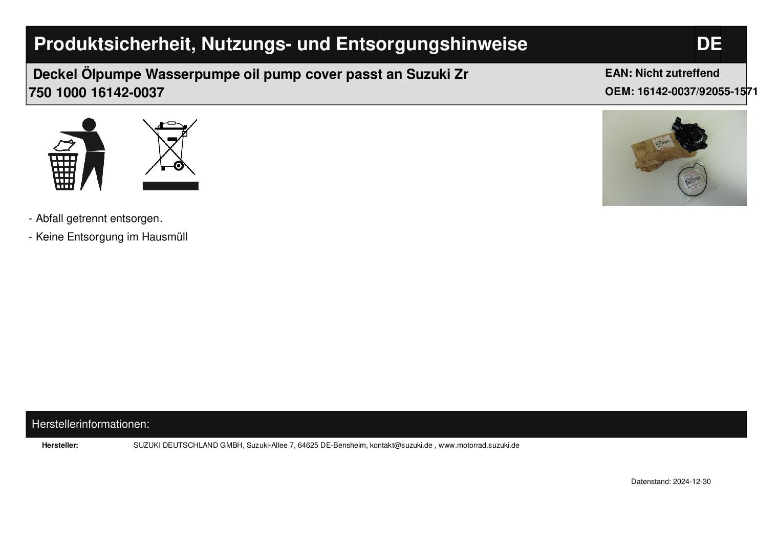 In dieser Auktion gibt es folgenden Artikel zu kaufen: Ölpumpe mit O-Ring Wasserpumpe (siehe Foto) Modell: passend für Suzuki ZR 750 Bj.: 07 ZR 1000 Bj.: 07 O-Ring Wasserpumpe ZX 900 Bj.: 98 - 03 ZX 1000 Bj.: 11 - 15 ZR 750 Bj.: 05 - 10 ZR 800 Bj.: 13 - 15 ZR 1000 Bj.: 03 - 14 KLZ 1000 Bj.: 12 - 15 Teilenummer: 16142-0037 + 92055-1571 Lieferumfang: siehe Foto Artikelzustand: neu aus Geschäftsauflösung, mit leichten Lagerspuren; Zustand siehe Foto Bei Unklarheiten oder Fragen bitte erst E-Mail schreiben.