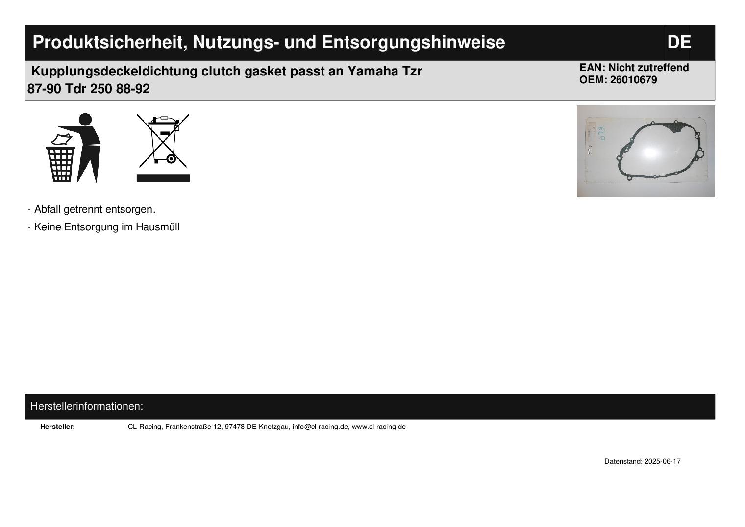 In dieser Auktion gibt es folgenden Artikel zu kaufen: Dichtung (siehe Foto) Modell: passend für Yamaha TZR 250 Bj.: 1987 - 1990 TDR 250 Bj.: 1988 - 1992 Lieferumfang: 1 Stück Artikelzustand: neu aus Geschäftsauflösung, mit minimalen Lagerspuren; Zustand siehe Foto Bei Unklarheiten oder Fragen bitte erst E-Mail schreiben.