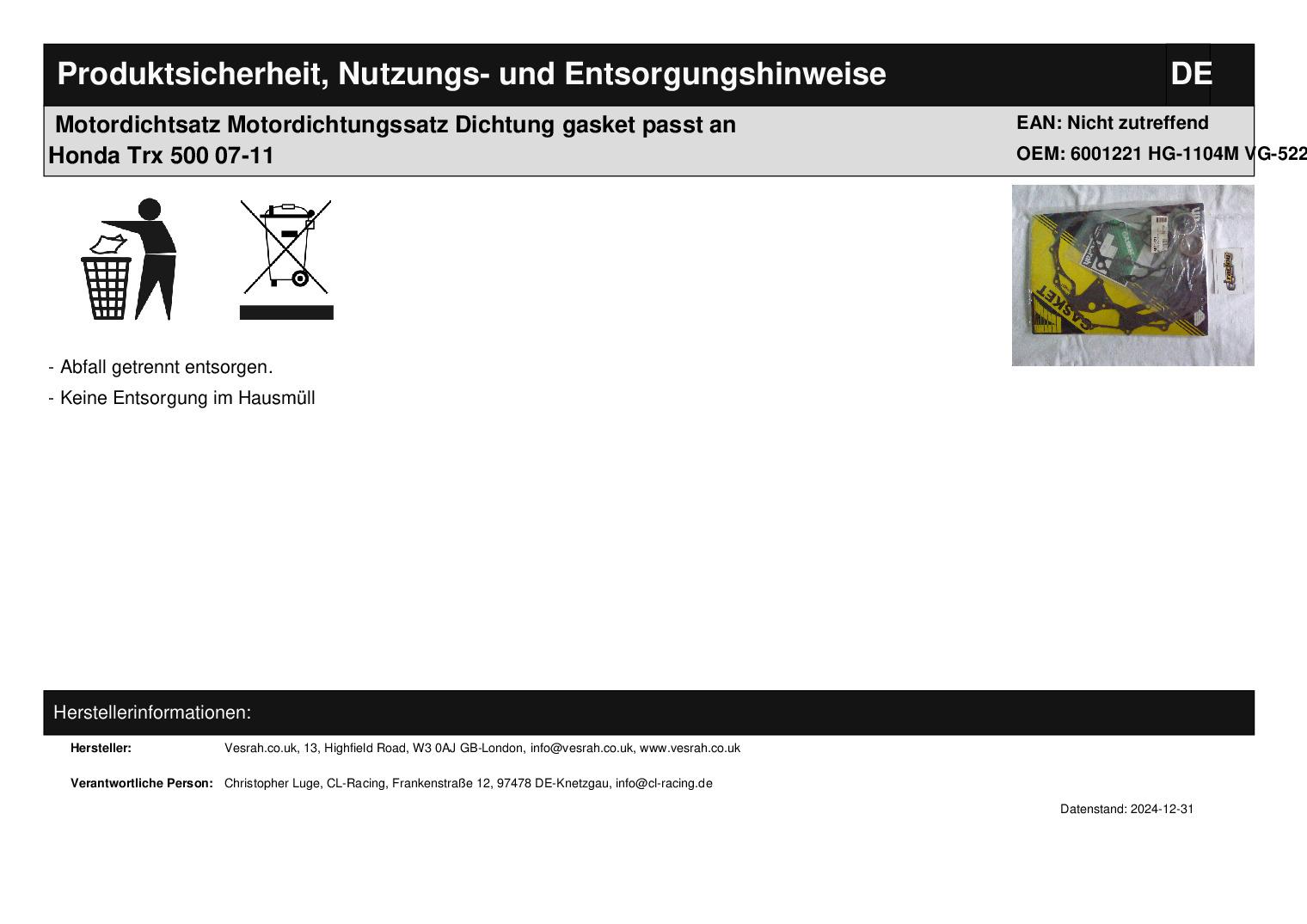• Motordichtsatz Motordichtungssatz Dichtung gasket passt an Honda Trx 500 07-11