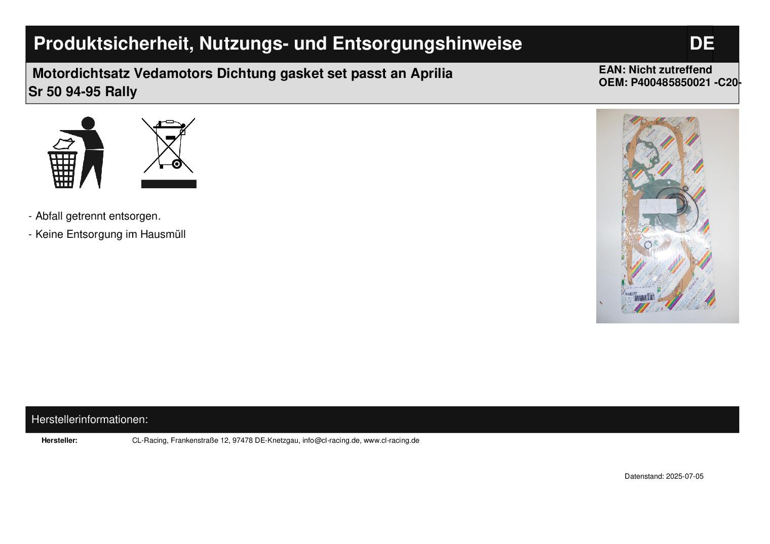 In dieser Auktion gibt es folgenden Artikel zu kaufen: Motordichtungssatz (siehe Foto) Hersteller: Vedamotors Modell: passend für Aprilia SR 50 Bj.: 94 - 95 Rally 50 Bj.: 96 - 99 Area 51 Bj.: 99 Lieferumfang: siehe Foto Artikelzustand: neu aus Geschäftsauflösung, mit minimalen Lagerspuren; Zustand siehe Foto Bei Unklarheiten oder Fragen bitte erst E-Mail schreiben.