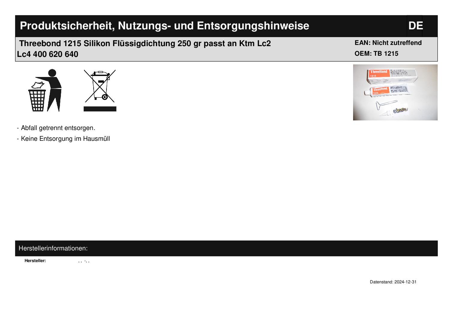 In dieser Auktion gibt es folgenden Artikel zu kaufen: Flüssigdichtung / Dichtmasse (siehe Foto) Hersteller: Three Bond 1215 Artikelbeschreibung: Ideal zum Abdichten von Motorgehäusen von Motorrädern, Rollern, Quads, ATV´s usw. Tubeninhalt: 250 Gramm Lieferumfang: 1 Stück Artikelzustand: neu Es handelt sich hierbei um kein Originalteil Bei Unklarheiten oder Fragen bitte erst E-Mail schreiben.