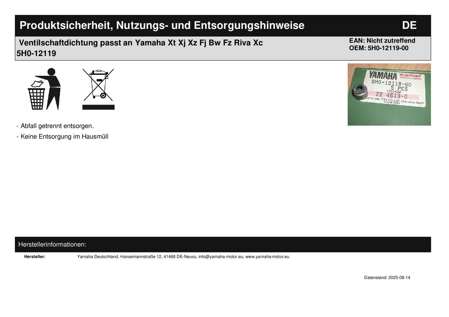 In dieser Auktion gibt es folgenden Artikel zu kaufen: Ventilschaftdichtung (siehe Foto) Modell: passend für Yamaha 1983 YTM200EK VALVE 1983 YTM200K VALVE 1983 YTM225DXK VALVE 1984 TRI-MOTO - YTM200L VALVE 1984 TRI-MOTO 225DX - YTM225DXL VALVE 1984 YAMAHAHAULER - YTM200EL VALVE 1985 MOTO-4 - YFM200N TOP END GASKET KIT 1985 MOTO-4 - YFM200N VALVE 1985 TRI-MOTO - YTM200ERN TOP END GASKET KIT 1985 TRI-MOTO - YTM200ERN VALVE 1985 TRI-MOTO - YTM200N VALVE 1985 TRI-MOTO - YTM225DRN VALVE 1985 TRI-MOTO - YTM225DXN VALVE 1986 MOTO-4 - YFM200DXS VALVE 1986 MOTO-4 - YFM225S VALVE 1986 TRI-MOTO 4-STROKE - YTM225DRS VALVE 1987 MOTO-4 - YFM200DXT VALVE 1987 MOTO-4 - YFM225T VALVE 1988 MOTO-4 - YFM200DXU VALVE 1988 MOTO-4 - YFM225U VALVE 1989 MOTO-4 - YFM200DXW VALVE 1989 MOTO-4 - YFM250W VALVE 1989 PRO HAULER 1889 PRO-4 - YFU1W VALVE 1989 PRO-4 PRO HAULER W-TURF TIRES - YFU1TW VALVE 1990 MOTO-4 - YFM250A VALVE 1991 MOTO-4 - YFM250B VALVE 1992 TIMBERWOLF 2WD - YFB250D VALVE 1992 YFB250D_MN VALVE 1993 TIMBERWOLF 2WD - YFB250E VALVE 1993 YFB250E_MN VALVE 1994 TIMBERWOLF 2WD - YFB250F VALVE 1994 TIMBERWOLF 4WD - YFB250FWF VALVE 1994 YFB250FWF_ VALVE 1994 YFB250FWF_MNH (ME & NH Only) VALVE 1995 TIMBERWOLF 2WD (ME & NH Only) - YFB250FWG_MNH VALVE 1995 TIMBERWOLF 2WD - YFB250FWG VALVE 1995 TIMBERWOLF 2WD - YFB250FWG_ VALVE 1995 TIMBERWOLF 2WD - YFB250G VALVE 1995 YFB250G_MNH (ME & NH ONLY) VALVE 1996 TIMBERWOLF - YFB250H VALVE 1996 TIMBERWOLF 2WD - YFB250FWH VALVE 1996 TIMBERWOLF 2WD - YFB250UH VALVE 1996 YFB250FWH_ VALVE 1996 YFB250FWH_MNH (ME &NH Only) VALVE 1996 YFB250H_MNH VALVE 1996 YFB250UH_MNH VALVE 1997 TIMBERWOLF 2WD (ME & NH Only) - YFB250FWJ_MNH VALVE 1997 TIMBERWOLF 2WD - YFB250FWJ VALVE 1997 TIMBERWOLF 2WD - YFB250FWJ_ VALVE 1997 TIMBERWOLF 2WD - YFB250UJ VALVE 1997 YFB250UJ_M VALVE 1998 TIMBERWOLF - YFB250UK VALVE 1998 TIMBERWOLF 4WD - YFB250FWK VALVE 1998 YFM250UK VALVE 1981 SR185H VALVE 1981 XJ550H VALVE XJ550H - J - K 1981 XJ550H VALVE XJ550H J K 1981 XJ550RH VALVE 1982 SR185J VALVE 1982 XJ550RJ TOP END GASKET KIT 1982 XJ550RJ VALVE 1982 XT125J VALVE 1982 XT200J VALVE 1982 XZ550RJ TOP END GASKET KIT 1982 XZ550RJ VALVE 1983 XJ550RK TOP END GASKET KIT 1983 XJ550RK VALVE 1983 XT125K VALVE 1983 XT125KC VALVE 1983 XT200K VALVE XT200K - KC 1983 XZ550RK HANDLE SWITCH - LEVER 1983 XZ550RK VALVE 1984 FJ600L TOP END GASKET KIT 1984 FJ600L VALVE 1984 FJ600LC TOP END GASKET KIT 1984 FJ600LC VALVE 1985 BIG WHEEL - BW200N TOP END GASKET KIT 1985 BIG WHEEL - BW200N VALVE 1985 FJ600N TOP END GASKET KIT 1985 FJ600N VALVE 1985 FJ600NC (CA ED.) TOP END GASKET KIT 1985 FJ600NC (CA ED.) VALVE 1986 BIG WHEEL - BW200S VALVE 1986 BIG WHEEL ELEC START - BW200ES VALVE 1986 FZ600S TOP END GASKET KIT 1986 FZ600S VALVE 1986 FZ600SC TOP END GASKET KIT 1986 FZ600SC VALVE 1986 RADIAN - YX600S TOP END GASKET KIT 1986 RADIAN - YX600S VALVE 1986 RADIAN - YX600SC TOP END GASKET KIT 1986 RADIAN - YX600SC VALVE 1986 TT225S VALVE 1987 BIG WHEEL ELEC START - BW200ET VALVE 1987 FZ600T TOP END GASKET KIT 1987 FZ600T VALVE 1987 RADIAN - YX600T VALVE 1987 RADIAN - YX600TC VALVE 1987 TRAILWAY - TW200T VALVE 1987 TRAILWAY - TW200TC VALVE 1987 TT225T VALVE 1988 BIG WHEEL ELEC START - BW200EU VALVE 1988 FZ600U VALVE 1988 FZ600UC (CA ED.) VALVE 1988 RADIAN - YX600U VALVE 1988 RADIAN - YX600UC VALVE 1988 TRAILWAY - TW200U VALVE 1988 TRAILWAY - TW200UC VALVE 1989 RADIAN - YX600W VALVE 1989 RADIAN - YX600WC VALVE 1989 TRAILWAY - TW200W VALVE 1989 TRAILWAY - TW200WC VALVE 1990 RADIAN - YX600A VALVE 1990 RADIAN - YX600AC VALVE 1990 TRAILWAY - TW200A VALVE 1990 TRAILWAY - TW200AC VALVE 1991 TRAILWAY - TW200B VALVE 1991 TRAILWAY - TW200BC VALVE 1992 SEROW - XT225D VALVE 1992 SEROW - XT225DC VALVE 1992 TRAILWAY - TW200D VALVE 1992 TRAILWAY - TW200DC VALVE 1993 SEROW - XT225E VALVE 1993 SEROW - XT225EC VALVE 1993 TRAILWAY - TW200E VALVE 1993 TRAILWAY - TW200EC VALVE 1994 SEROW - XT225F VALVE 1994 SEROW - XT225FC VALVE 1994 TRAILWAY - TW200F VALVE 1994 TRAILWAY - TW200FC VALVE 1995 SEROW - XT225G VALVE 1995 SEROW - XT225GC VALVE 1995 TRAILWAY - TW200G VALVE 1995 TRAILWAY - TW200GC VALVE 1996 SEROW - XT225H VALVE 1996 SEROW - XT225HC VALVE 1996 TRAILWAY - TW200EH VALVE 1996 TRAILWAY - TW200EHC VALVE 1996 TW200H VALVE 1996 TW200HC (CA ED.) VALVE 1997 SEROW - XT225J VALVE 1997 SEROW - XT225JC VALVE 1997 TRAILWAY - TW200J VALVE 1997 TRAILWAY - TW200JC VALVE 1998 SEROW - XT225K VALVE 1998 SEROW - XT225KC VALVE 1998 TRAILWAY - TW200EK VALVE 1998 TRAILWAY - TW200EKC VALVE 1998 TRAILWAY - TW200K VALVE 1998 TRAILWAY - TW200KC VALVE 1983 XC180K TOP END GASKET KIT 1983 XC180K VALVE XC180K - KC - L - LC 1983 XC180KC TOP END GASKET KIT 1984 RIVA 180 - XC180L TOP END GASKET KIT 1984 RIVA 180 - XC180LC TOP END GASKET KIT 1984 RIVA 180Z - XC180ZL TOP END GASKET KIT 1984 RIVA 180Z - XC180ZL VALVE 1984 RIVA 180Z - XC180ZLC TOP END GASKET KIT 1984 RIVA 180Z - XC180ZLC VALVE 1985 RIVA 180 - XC180DN TOP END GASKET KIT 1985 RIVA 180 - XC180DN VALVE 1985 RIVA 180 - XC180DNC TOP END GASKET KIT 1985 RIVA 180 - XC180DNC VALVE 1985 RIVA 180 - XC180N TOP END GASKET KIT 1985 RIVA 180 - XC180N VALVE 1985 RIVA 180 - XC180NC TOP END GASKET KIT 1985 RIVA 180 - XC180NC VALVE 1985 RIVA 180 - XC180ZN TOP END GASKET KIT 1985 RIVA 180 - XC180ZN VALVE 1985 RIVA 180 - XC180ZNC TOP END GASKET KIT 1985 RIVA 180 - XC180ZNC VALVE 1987 RIVA 200 - XC200T VALVE 1987 RIVA 200Z - XC200ZT VALVE 1987 XC200CT VALVE 1987 XC200ZCT VALVE 1988 RIVA 200 - XC200U VALVE 1988 RIVA 200Z - XC200ZU VALVE 1989 RIVA 200 - XC200W VALVE 1989 RIVA 200Z - XC200ZW VALVE 1990 RIVA 200Z - XC200ZA VALVE 1991 RIVA 200 - XC200B VALVE Lieferumfang: 1 Stück Artikelzustand: neu aus Geschäftsauflösung, mit leichten Lagerspuren; Zustand siehe Foto Bei Unklarheiten oder Fragen bitte erst E-Mail schreiben.
