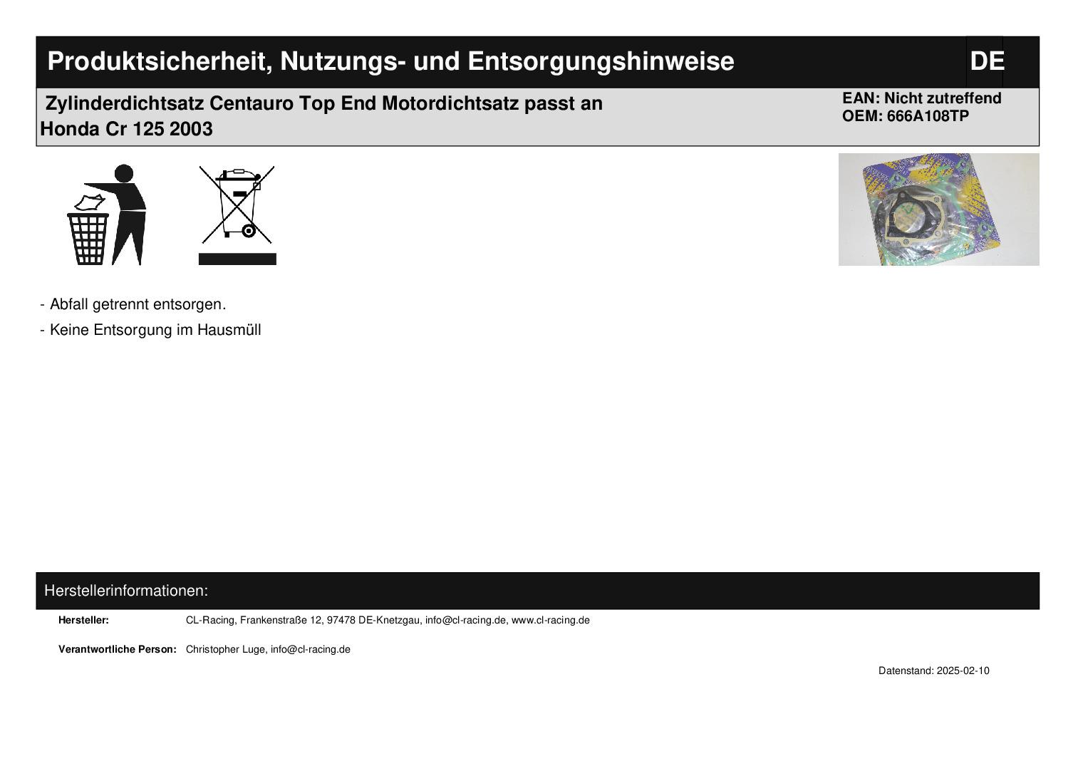 In dieser Auktion gibt es folgenden Artikel zu kaufen: Top-End-Zylinderdichtsatz (siehe Foto) Hersteller: Centauro Modell: passend für Honda CR 125 R Bj.: 03 Lieferumfang: siehe Foto Artikelzustand: neu aus Geschäftsauflösung, mit minimalen Lagerspuren; Zustand siehe Foto Bei Unklarheiten oder Fragen bitte erst E-Mail schreiben.