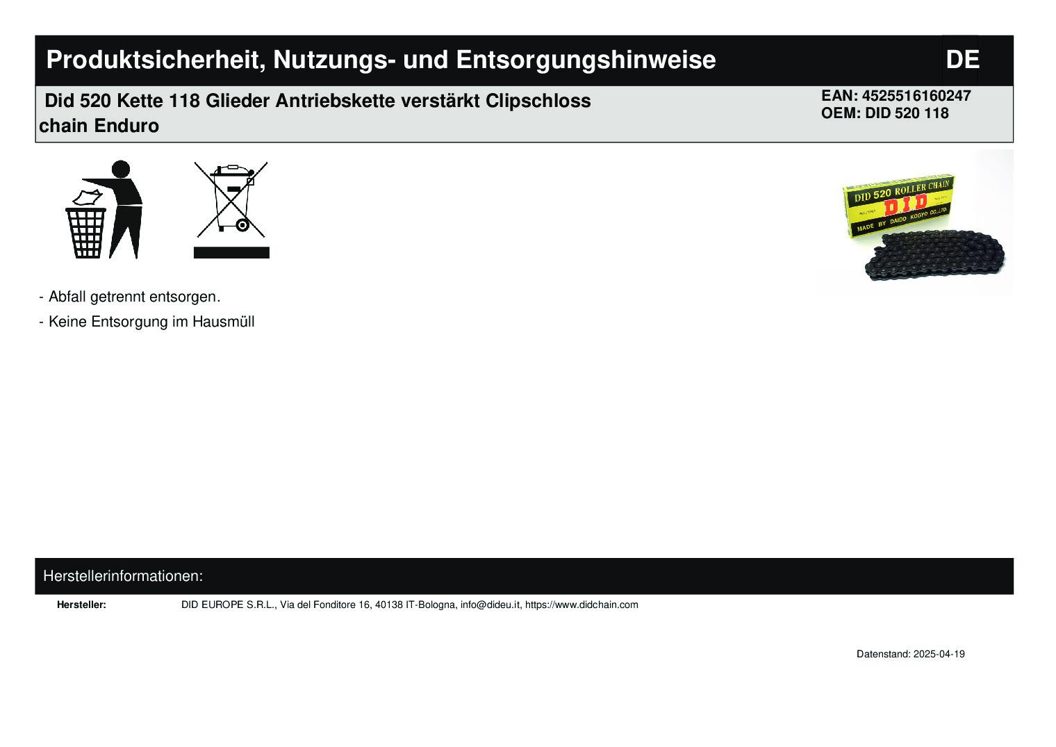 In dieser Auktion gibt es folgenden Artikel zu kaufen: verstärkte Kette (siehe Foto) Typ: DID 520 Gliederzahl: 118 Vor dem Kauf bitte den Kettentyp und Kettenlänge prüfen! Lieferumfang: Kette offen mit Clipschloss Artikelzustand: neu