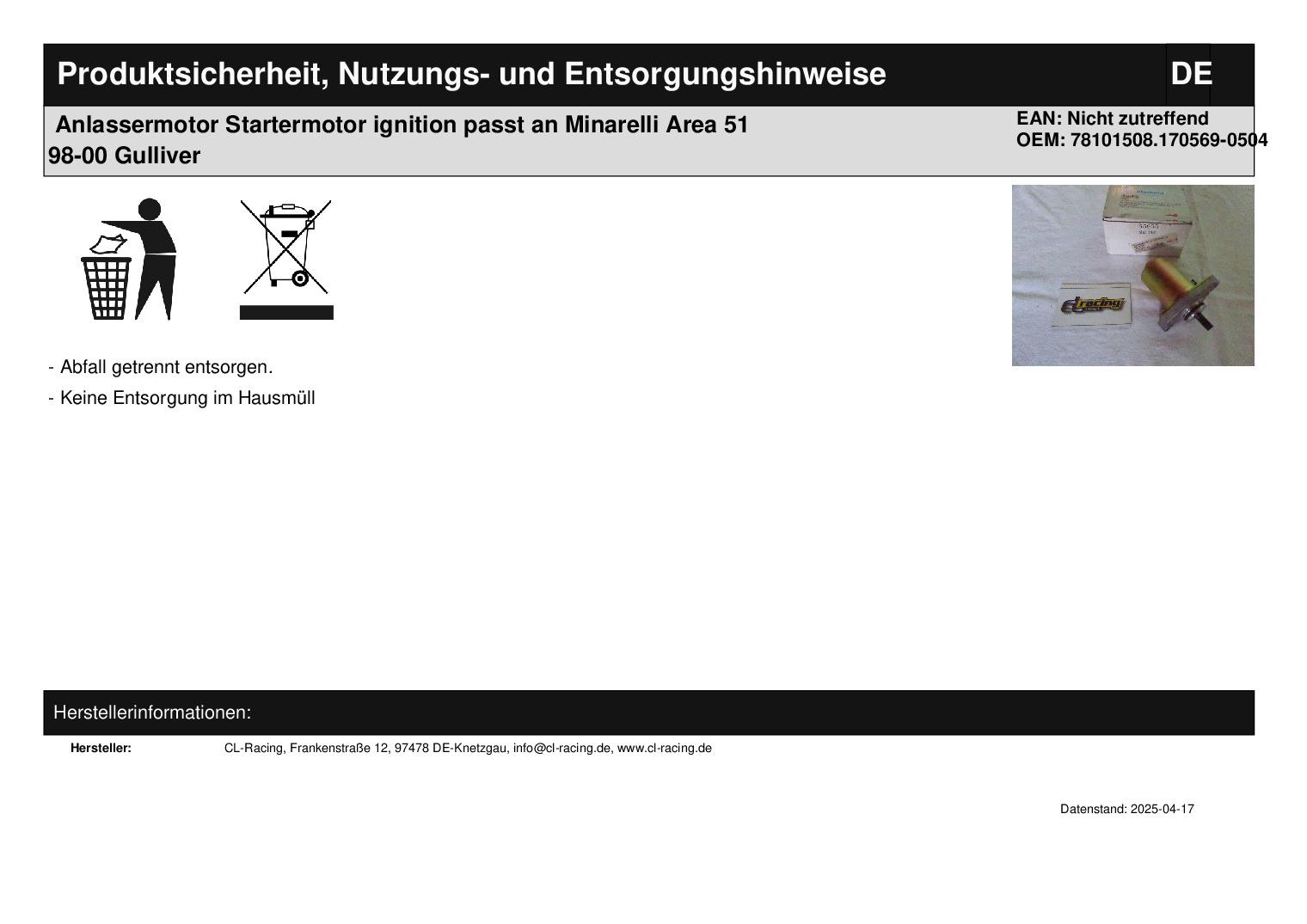 In dieser Auktion gibt es folgenden Artikel zu kaufen: Anlassermotor (siehe Foto) Modell: passend für Minarelli Amico Bj.: 94 Amico Gl-Gle Bj.: 93 - 95 Area 51 Bj.: 98 - 00 Gulliver Bj.: 95 - 98 Gulliver Lc Bj.: 96 - 98 Rally Bj.: 95 - 03 Rally Liquid Cooled Bj.: 96 - 99 Sr Bj.: 94 - 96 Sr Www Bj.: 97 - 01 Lieferumfang: siehe Foto Artikelzustand: neu aus Geschäftsauflösung, mit leichten Lagerspuren; Zustand siehe Foto Bei Unklarheiten oder Fragen bitte erst E-Mail schreiben.