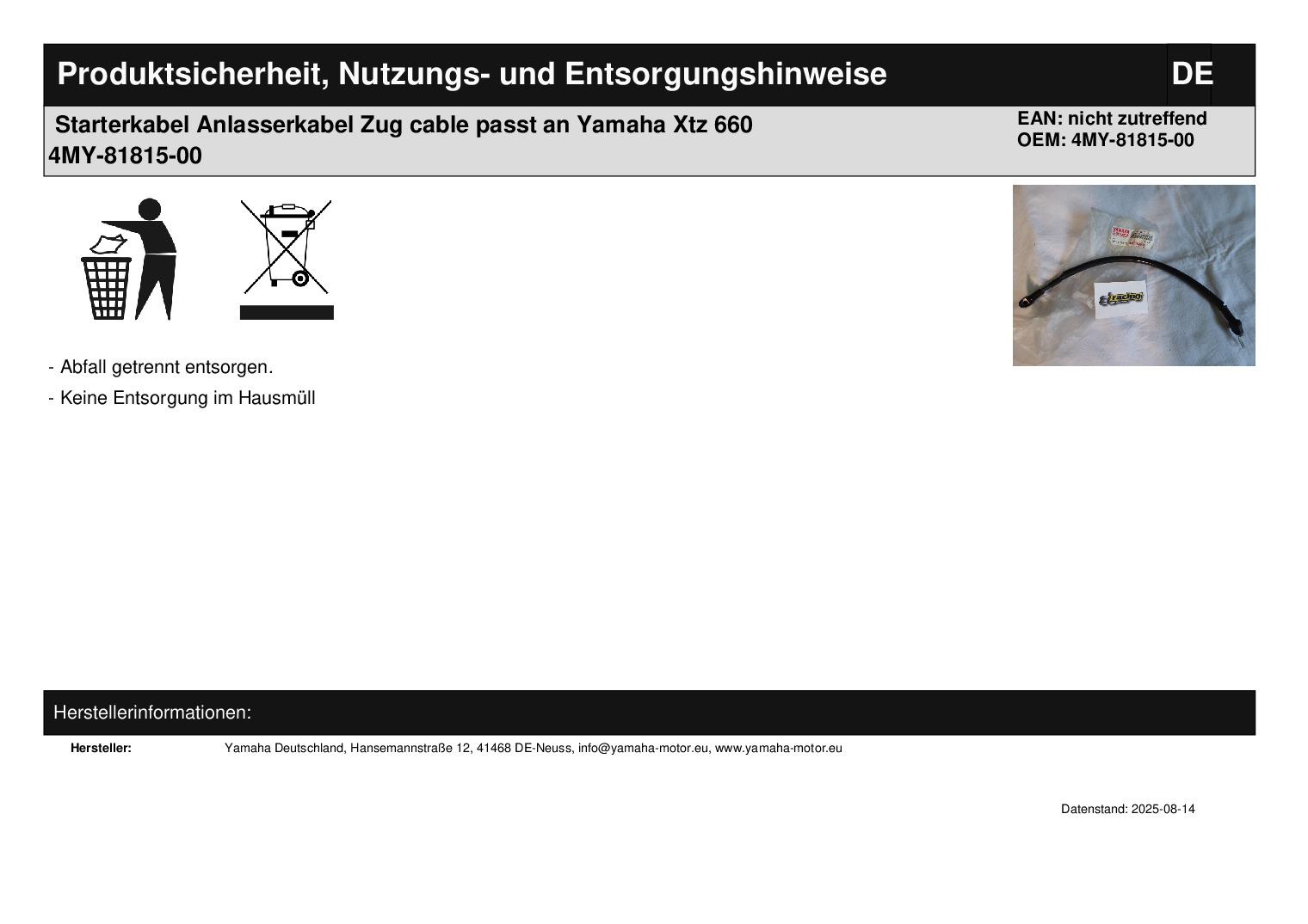 In dieser Auktion gibt es folgenden Artikel zu kaufen: Starterkabel (siehe Foto) Modell: passend für Yamaha XTZ 660 Bj.: 1996 Lieferumfang: 1 Stück Artikelzustand: neu aus Geschäftsauflösung, mit leichten Lagerspuren; Zustand siehe Foto