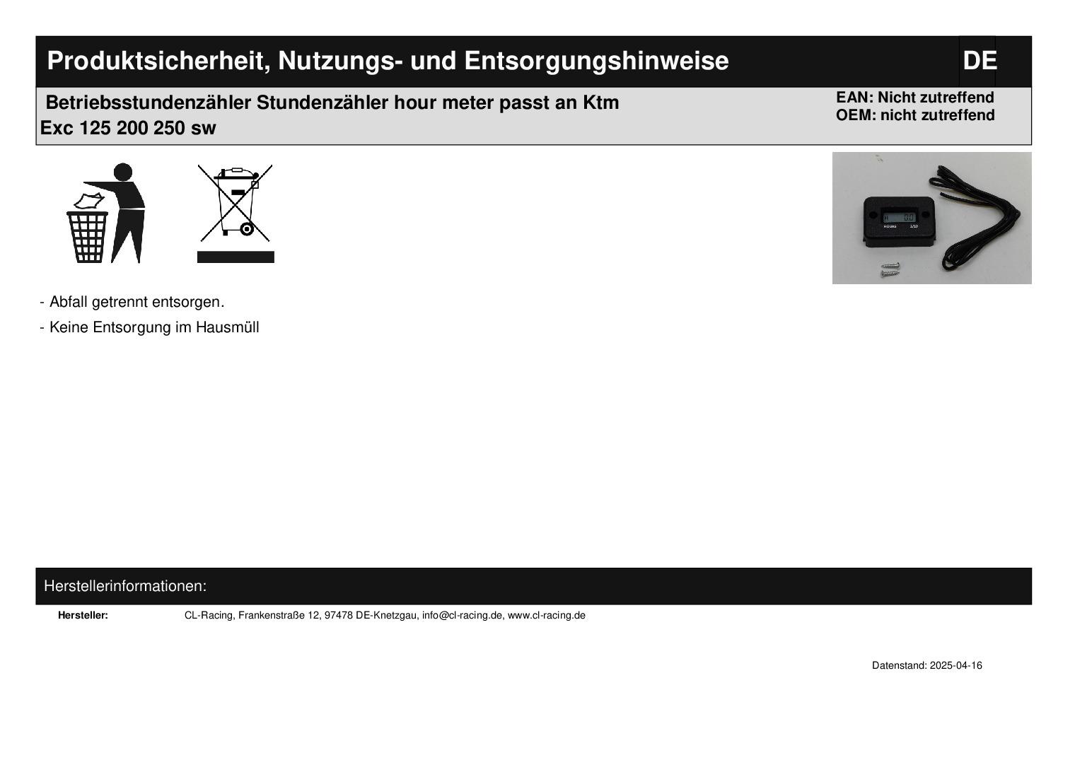 Betriebsstundenzähler Stundenzähler hour meter passt an Ktm Exc 125 200 250 sw