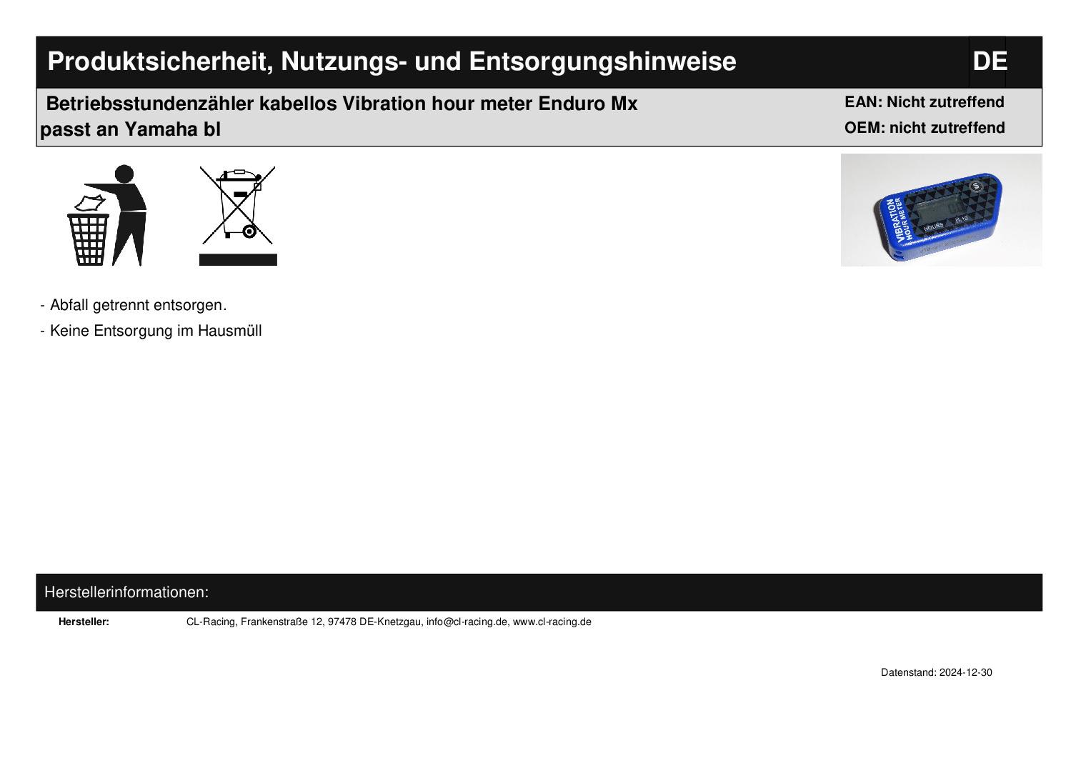 In dieser Auktion gibt es folgenden Artikel kaufen: Vibrations-Betriebsstundenzähler (siehe Foto) Artikelbeschreibung: wasserdichter, rückstellbarer Betriebsstundenzähler; kann leicht und schnell am Fahrzeug verbaut werden; ideal um Kundendienste (Öl-, Kolbenwechsel usw.) pünktlich durchführen zu können Betriebsstundenzähler ist kabellos, d. h. der Zählvorgang erfolgt automatisch, sobald der Motor startet Abmaße: 68 x 33 x 14 mm (L x B x H) Lieferumfang: 1 Stück Artikelzustand: neu Bei Unklarheiten oder Fragen bitte erst E-Mail schreiben.