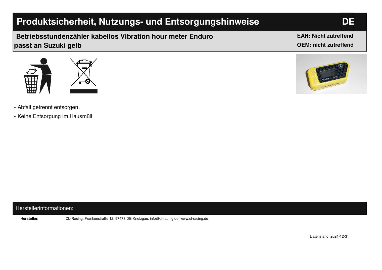 In dieser Auktion gibt es folgenden Artikel kaufen: Vibrations-Betriebsstundenzähler (siehe Foto) Artikelbeschreibung: wasserdichter, rückstellbarer Betriebsstundenzähler; kann leicht und schnell am Fahrzeug verbaut werden; ideal um Kundendienste (Öl-, Kolbenwechsel usw.) pünktlich durchführen zu können Betriebsstundenzähler ist kabellos, d. h. der Zählvorgang erfolgt automatisch, sobald der Motor startet Abmaße: 68 x 33 x 14 mm (L x B x H) Lieferumfang: 1 Stück Artikelzustand: neu Bei Unklarheiten oder Fragen bitte erst E-Mail schreiben.