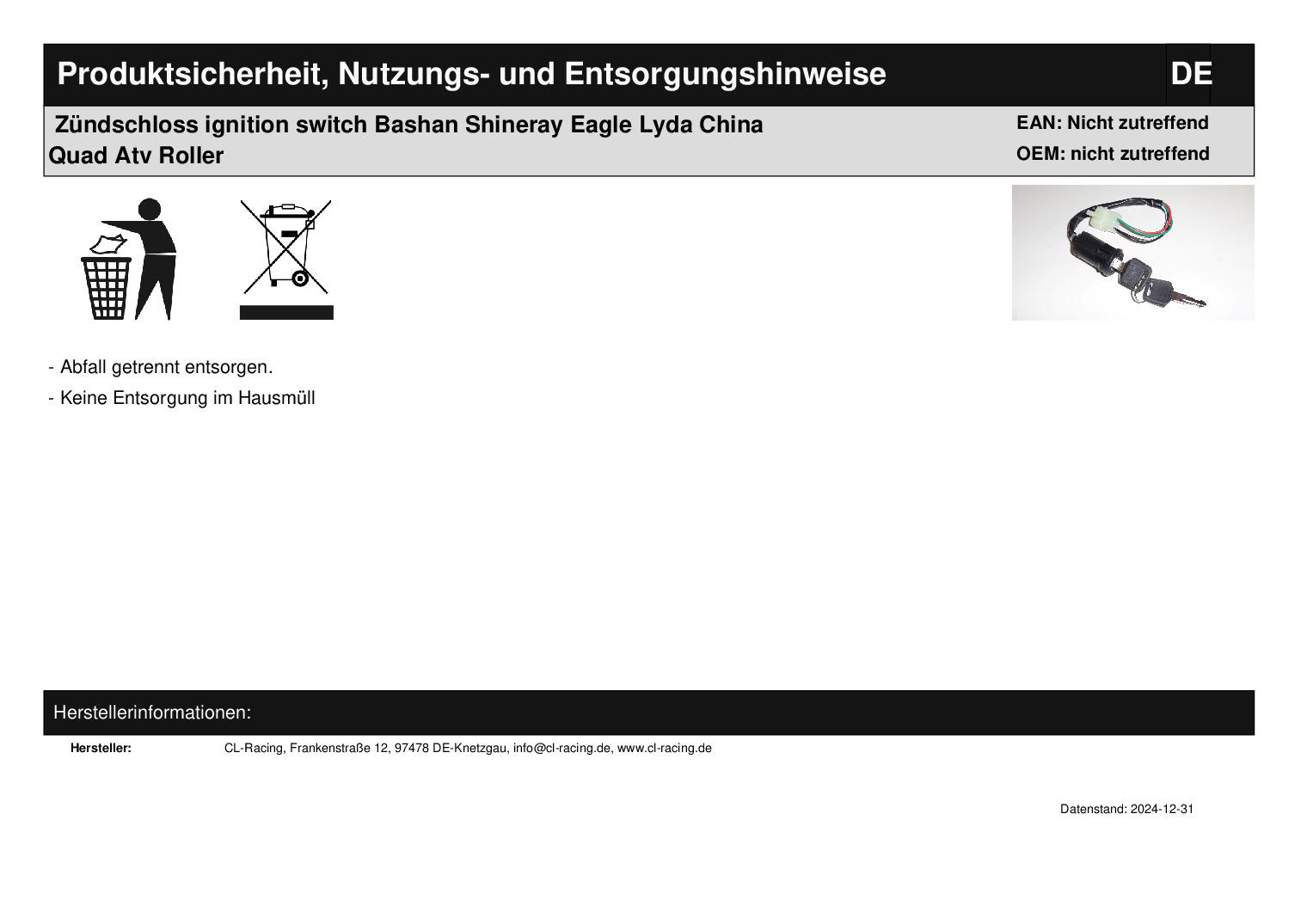 In dieser Auktion gibt es folgenden Artikel zu kaufen: Zündschloss aus dem Zubehör (siehe Foto) passend für: China Atv´s und Quads z. B. Eagle, Shenke Jinling, Bashan, Shineray etc. Bitte vor dem Kauf unbedingt den Stecker vergleichen! Lieferumfang: 1 Stück Artikelzustand: neu Bei Unklarheiten oder Fragen bitte erst E-Mail schreiben.