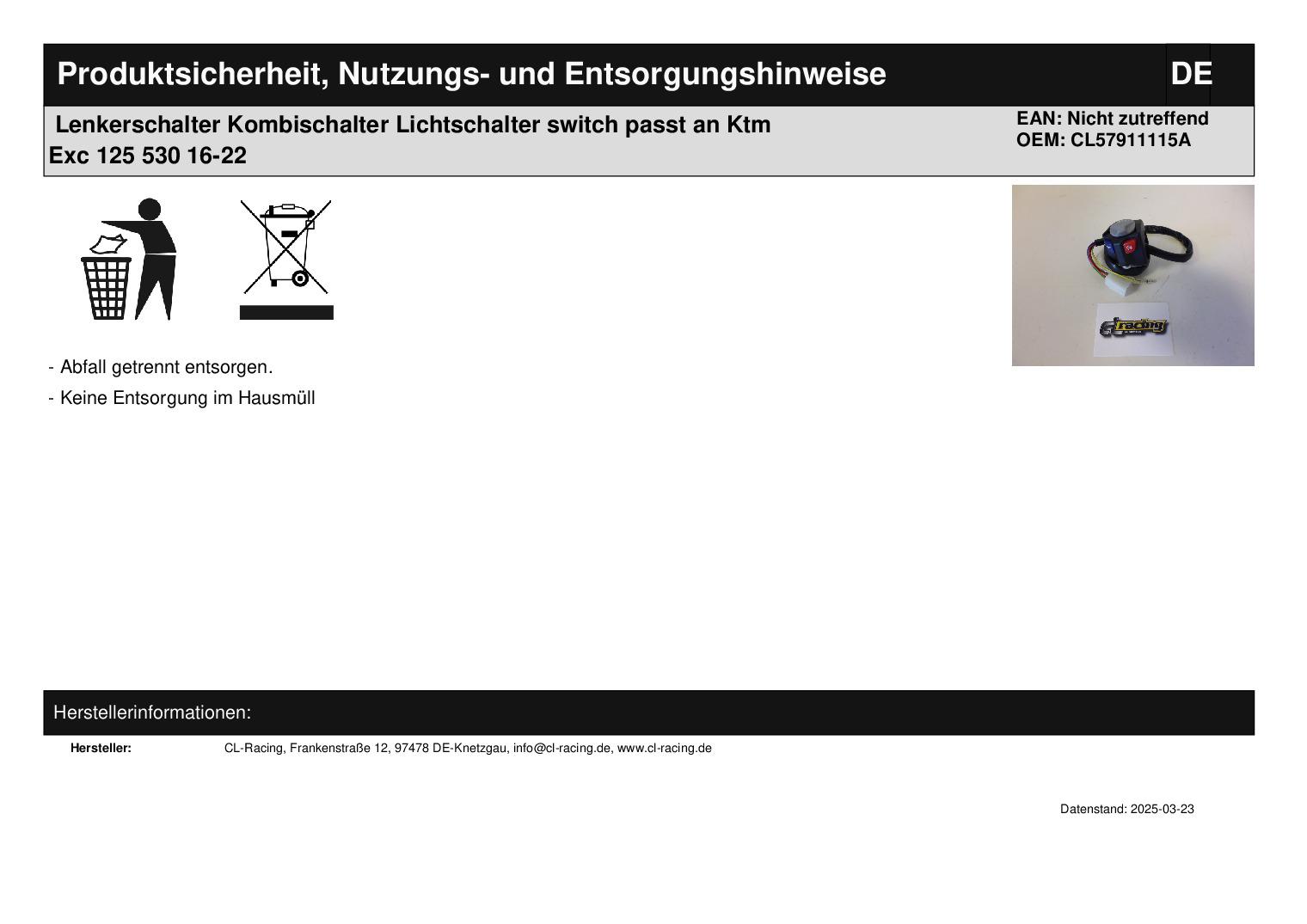 • Lenkerschalter Kombischalter Lichtschalter switch passt an Ktm Exc 125 530 16-22